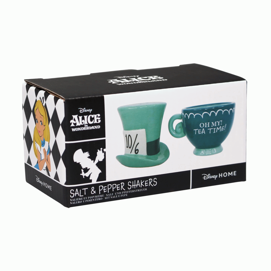 Комплектът от солница и пиперница представлява шапката на Лудия шапкар и чашка за чай. Изработени са от висококачествена керамика и са ръчно рисувани, а след това глазирани. Тематично бихте могли да ги използвате и за сладки подправки към кафето или чая, като канела или индийско орехче, например.