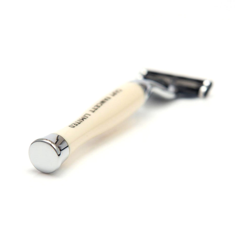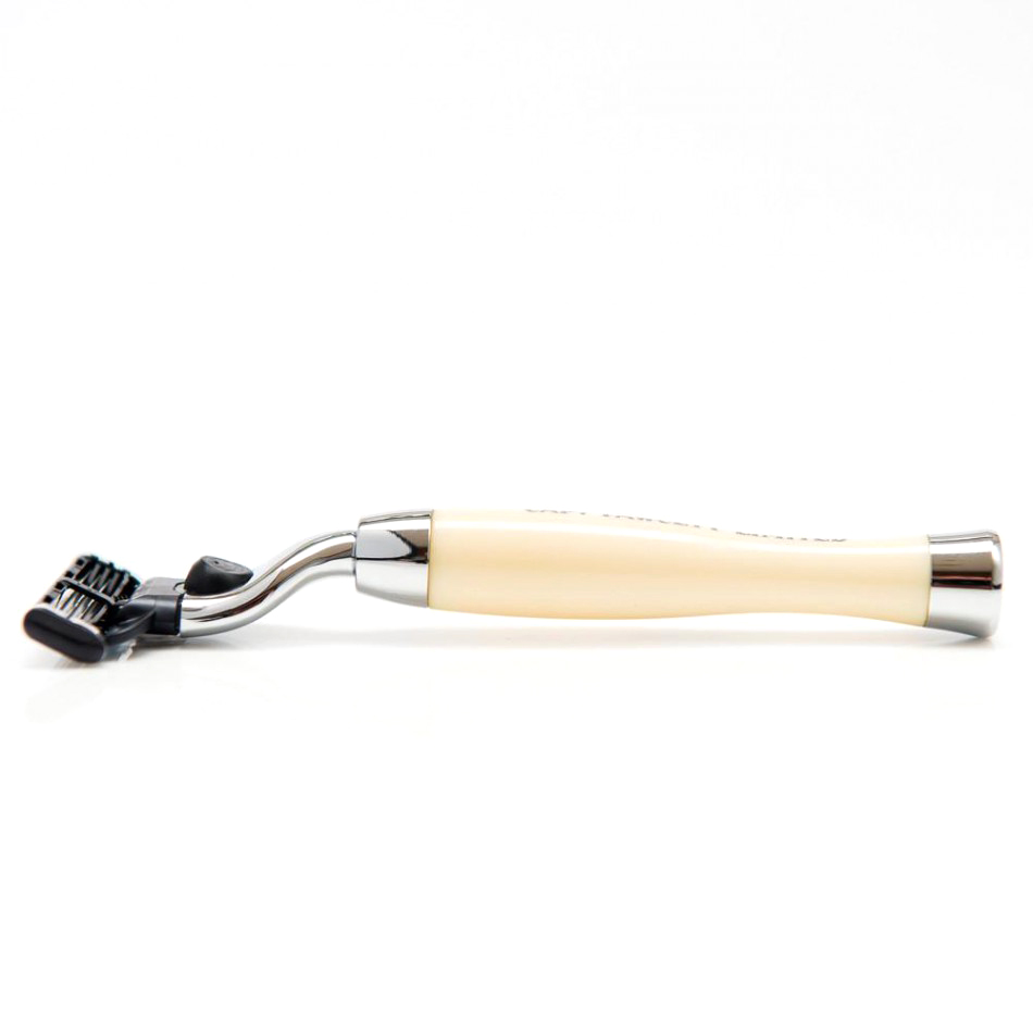 Ще откриете, че перфектно балансираната самобръсначка осигурява великолепно бръснене и е истинско удоволствие за използване. Истинският режещ ръб на традиционното мокро бръснене вече е достъпен за всички съвременни авантюристи. Имитация на дръжка от слонова кост с хромирана яка и основа. - • Материал: неръждаема стомана