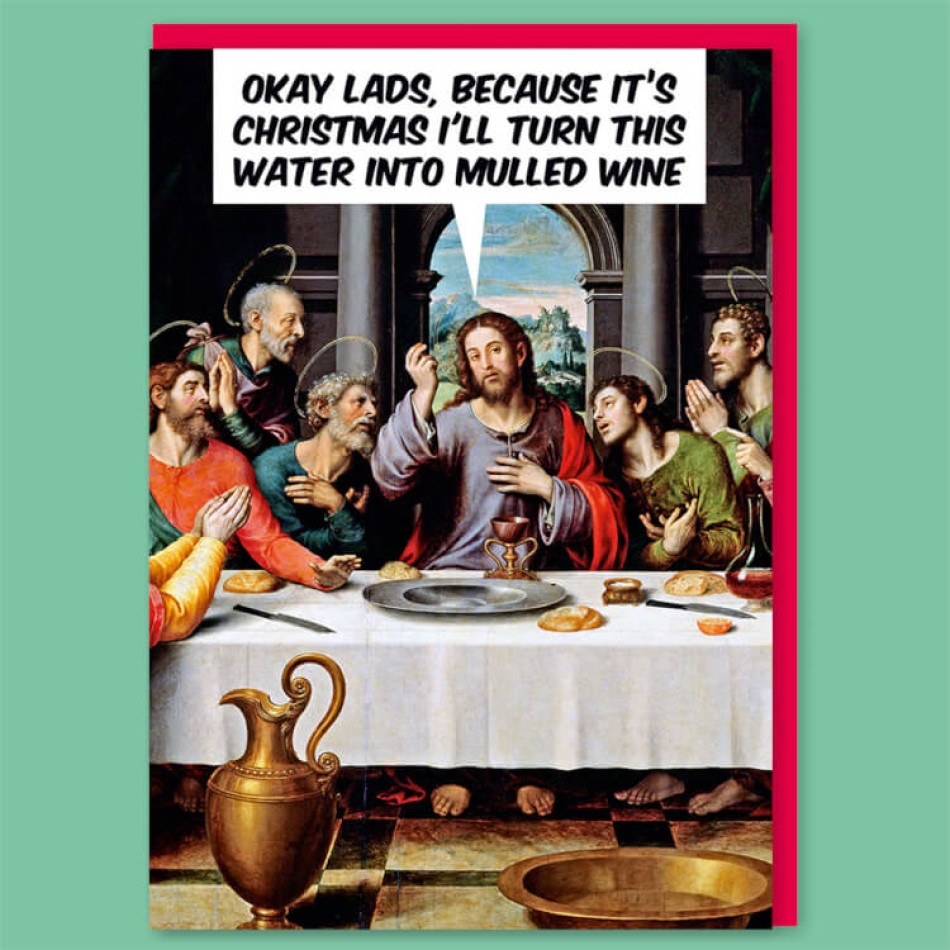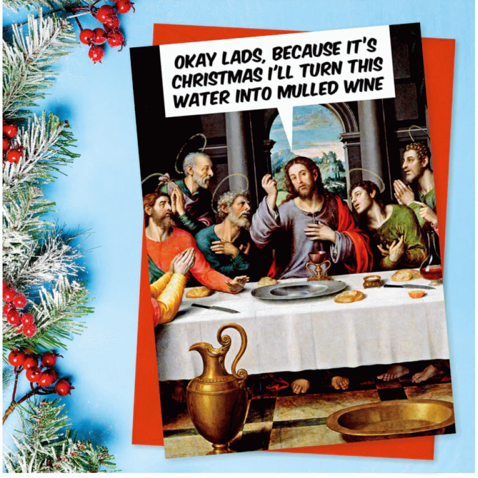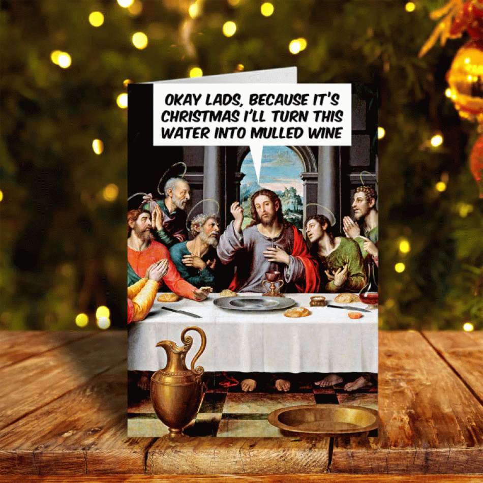 Копирайт: Dean Morris Cards Представяме Ви картичката „Добре, момчета, понеже е Коледа, ще превърна тази вода в греяно вино.“ – хумористичен поздрав с празничен привкус и божествено чувство за шега. Със закачлива препратка към класическа сцена и неочакван обрат, тя превръща Коледа в повод за смях и добро настроение – защото, ако някой може да направи чудо… защо да не е с греяно вино?