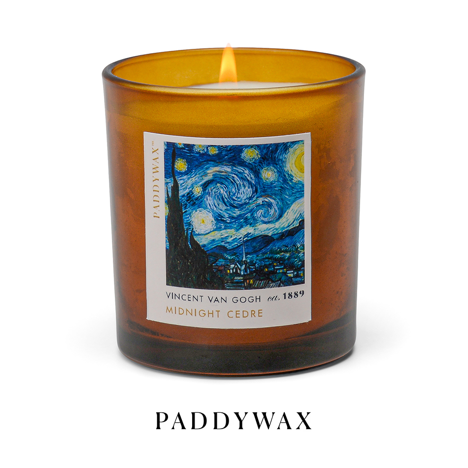 Ароматната свещ Падивакс в стъклена чаша "Импресионист: Звездна нощ на Ван Гог" ухае на среднощни кедри, пушек и износена кожа.