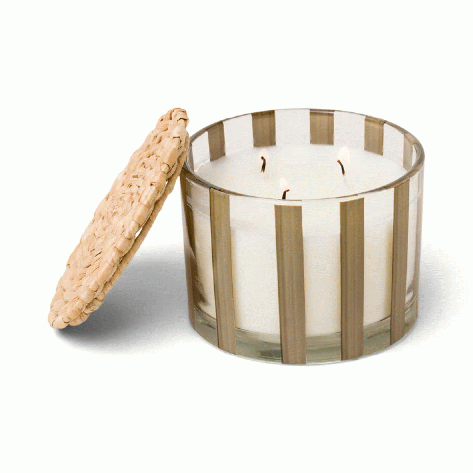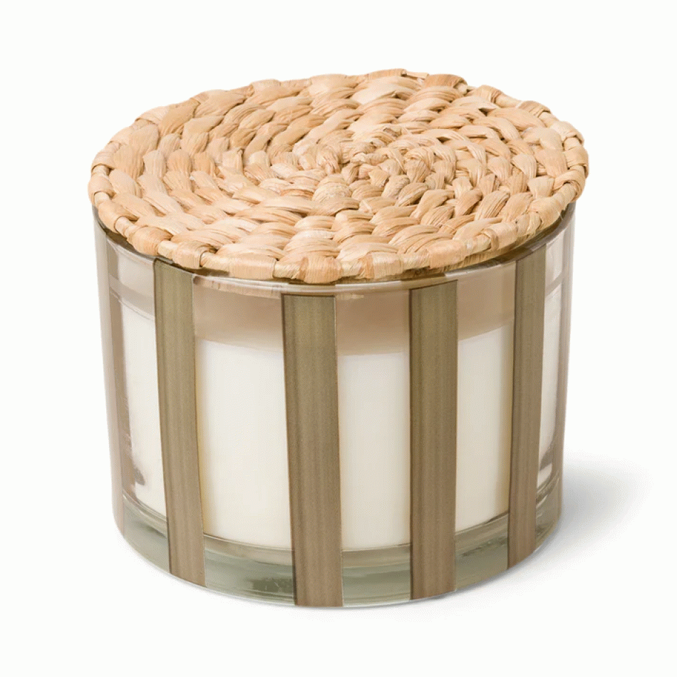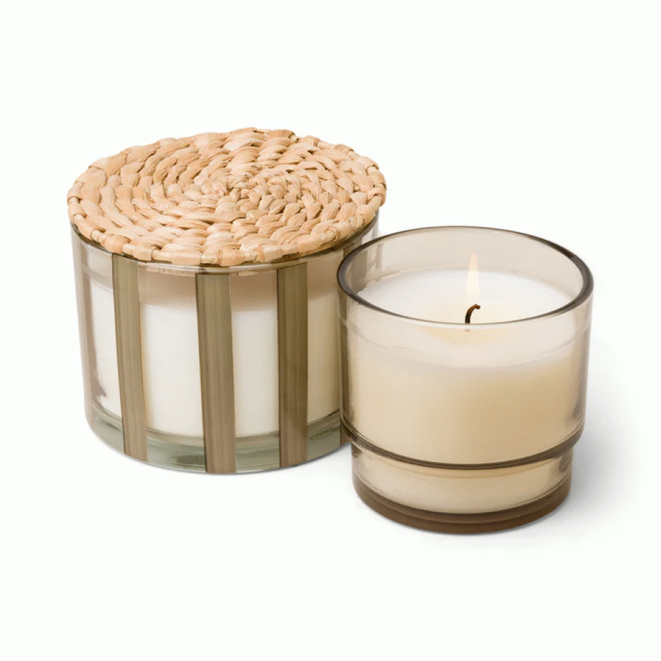 Ароматна соева свещ Падивакс Al Fresco - стъклена чаша на бежови раета с капак - памук и тиково дърво