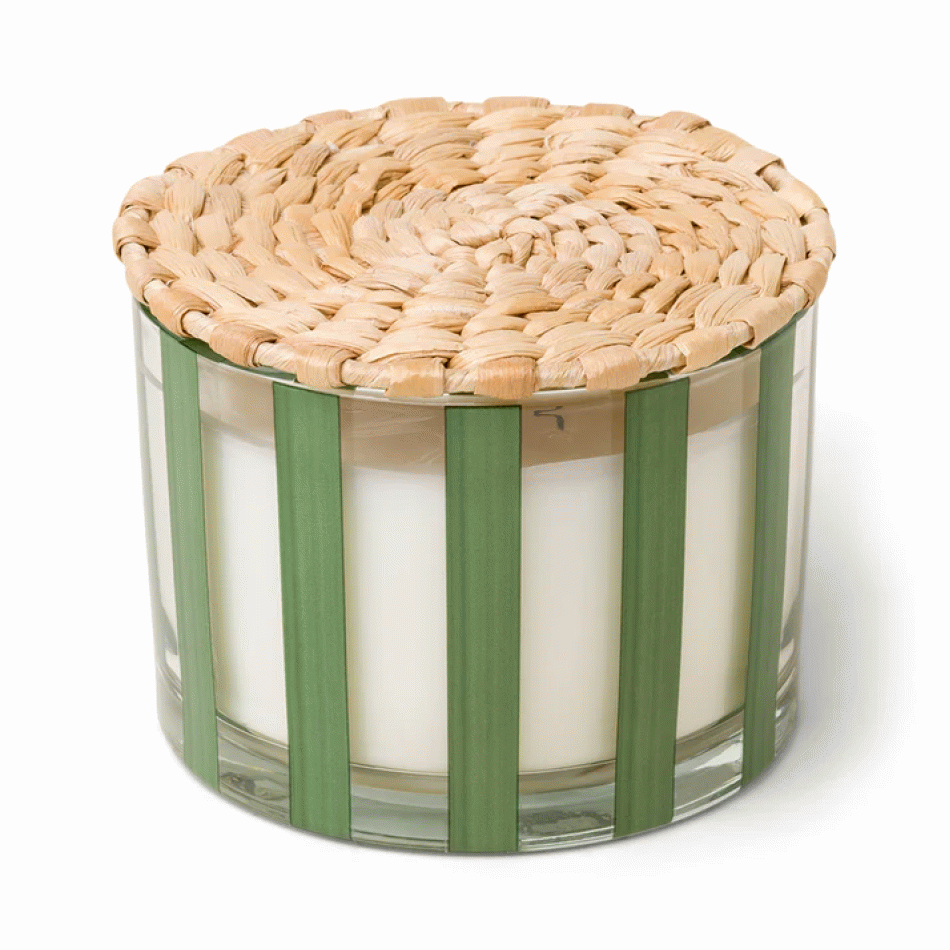 Копирайт: © Paddywax - Свежи аромати, елегантен дизайн и устойчиви съдове? Представяме ви Ароматна соева свещ в стъклена чаша на зелени раета Al Fresco - мъгла от лайм. Вдъхновена от чадърите, които се срещат по европейските плажове, и цветовете на Френската Ривиера, колекцията Al Fresco представя вечни раирани стъклени съдове и освежаващи аромати. Тази свещ от 340g е ръчно излята в стъклен съд за многократна употреба със стилен ратанов капак, който може да се използва за съхранение на бижута, офис консумативи или всякакви малки предмети след отстраняване на восъка.Връхни нотки: Малинов цвят, Цитрус-лайм, ЯбълкаСредни нотки: Жасмин, РозаБазови нотки: Мускус, Дъбов мъх, КехлибарСоевите свещи на Paddywax се изработват от естествена растителна восъчна основа на висококачествена виетнамска соя, която гори несравнимо по-чисто и не отделя вредни вещества. Освен това соевите ни свещи горят значително по-дълго и разпръскват аромата чувствително по-равномерно от масовите свещи с парафин. Падивакс е един от водещите брандове в света на бутиковите соеви свещи и сме горди да бъдем техните дистрибутори за България.