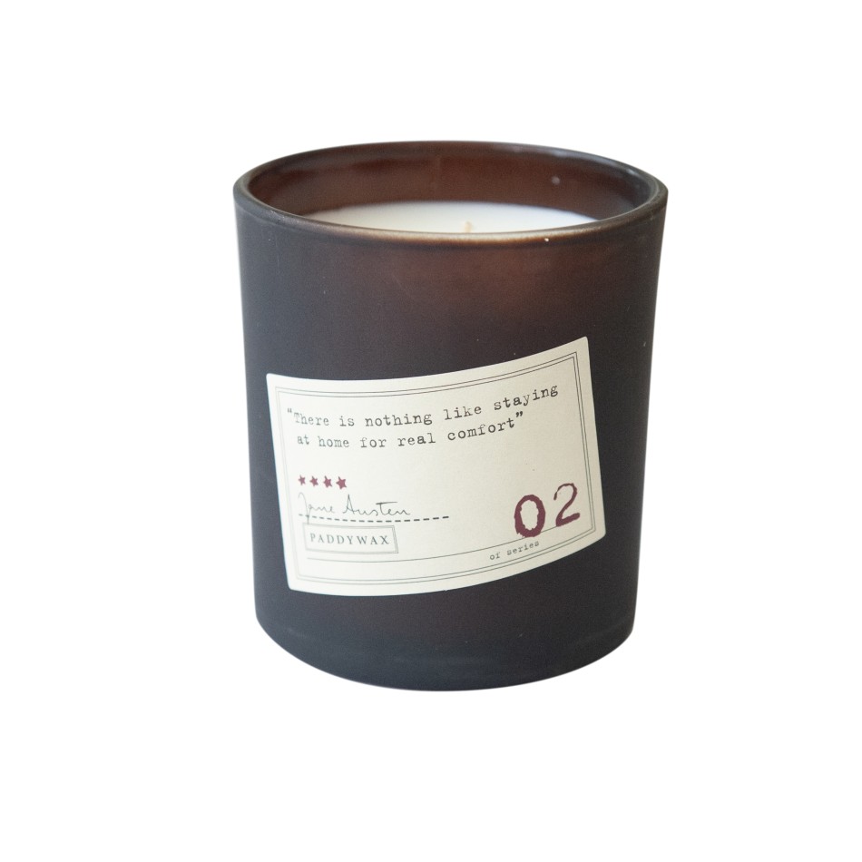 Вътре в кутията ще откриете стъклена чашка в тъмен цвят и прекрасния аромат на свещта. Върху всяка чашка от серията е поставен цитат на автора. Джейн Остин казва: "Няма нищо по-хубаво от това да си седиш вкъщи за истински комфорт".