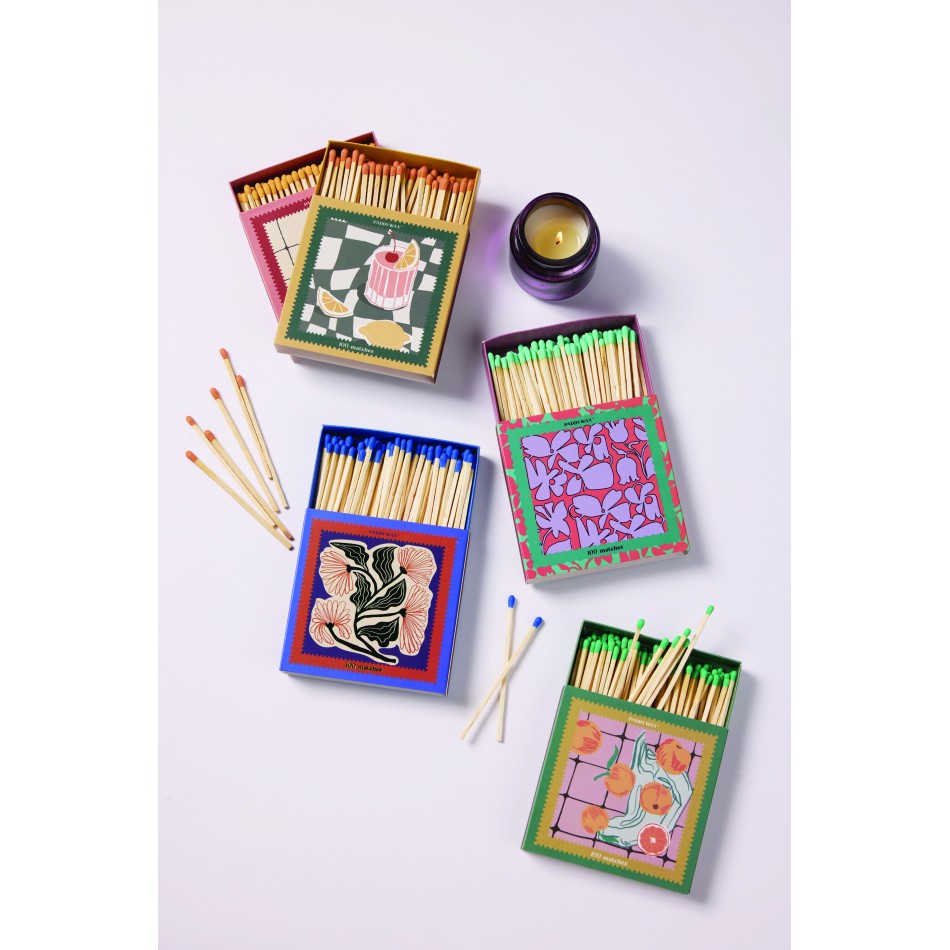 Кутията е истинско мини произведение на изкуството – украсена с ръчно илюстрирани портокали върху стилен фон, допълнена с гланцови или металически акценти. Вътре ще откриете дълги кибритени клечки с цветни върхове, съобразени с дизайна, които са не само красиви, но и удобни за безопасно запалване на свещи.