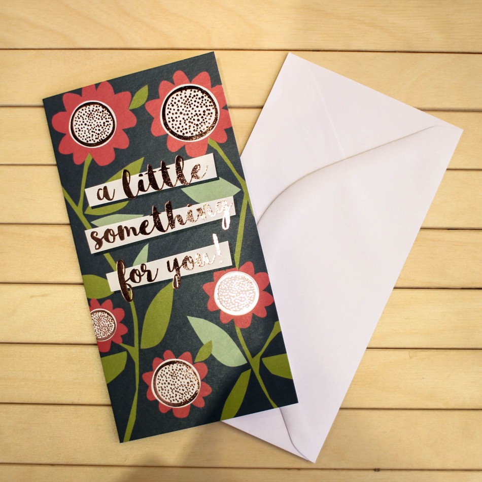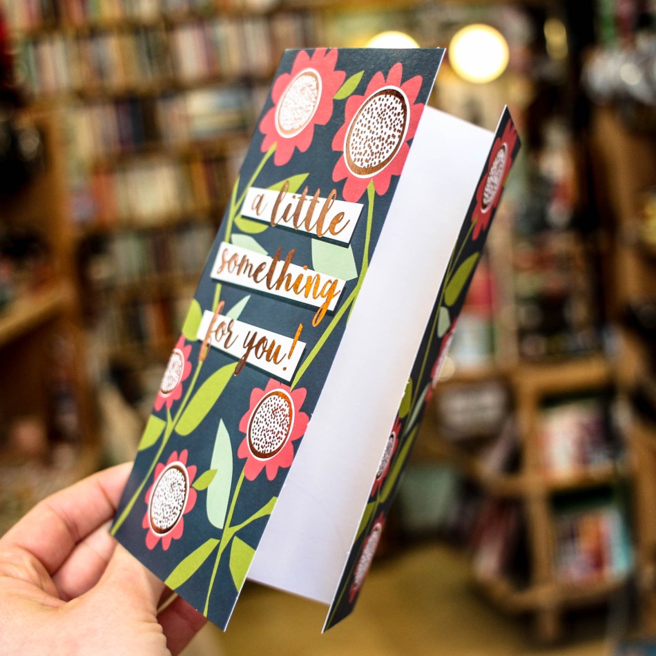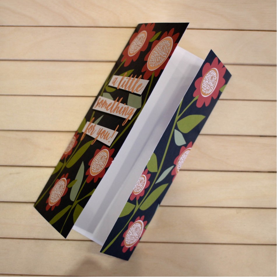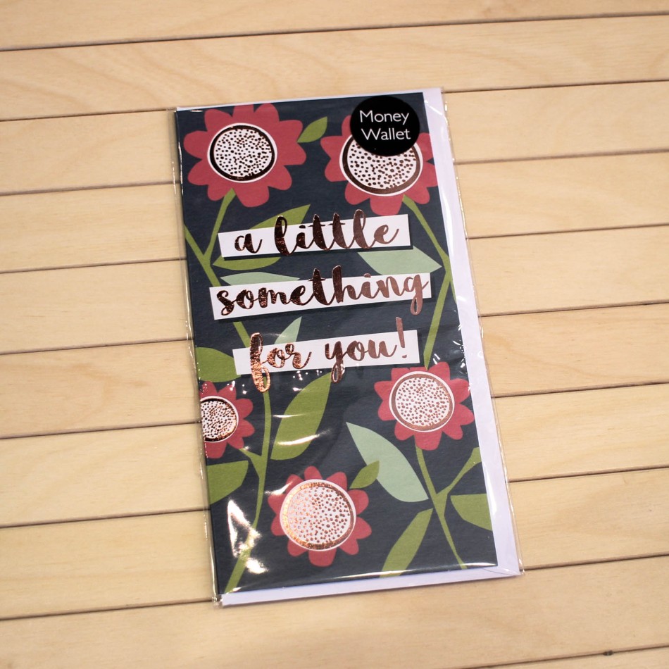 Поздравителна картичка "A little something for you". Изработена изключително детайлно и качествено. От хубава дебела хартия, с изпъкнал надпис и орнаменти. Чудесен избор ако подарявате пари, билети или ваучери тъй като има специално предназначен джоб и форма.