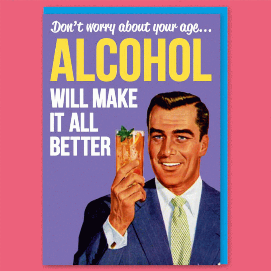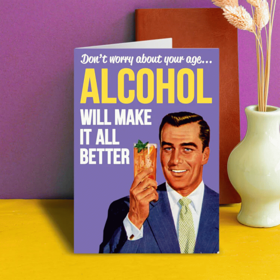 Копирайт: Dean Morris Cards Представяме Ви Поздравителна картичка: Не се притеснявай за възрастта - Алкохолът ще оправи всичко! – класически пример за честен, леко саркастичен хумор, който казва всичко без излишни увъртания. Перфектният избор за рожден ден, когато реалистичният план за вечерта е… просто да се отпуснете и да се посмеете.