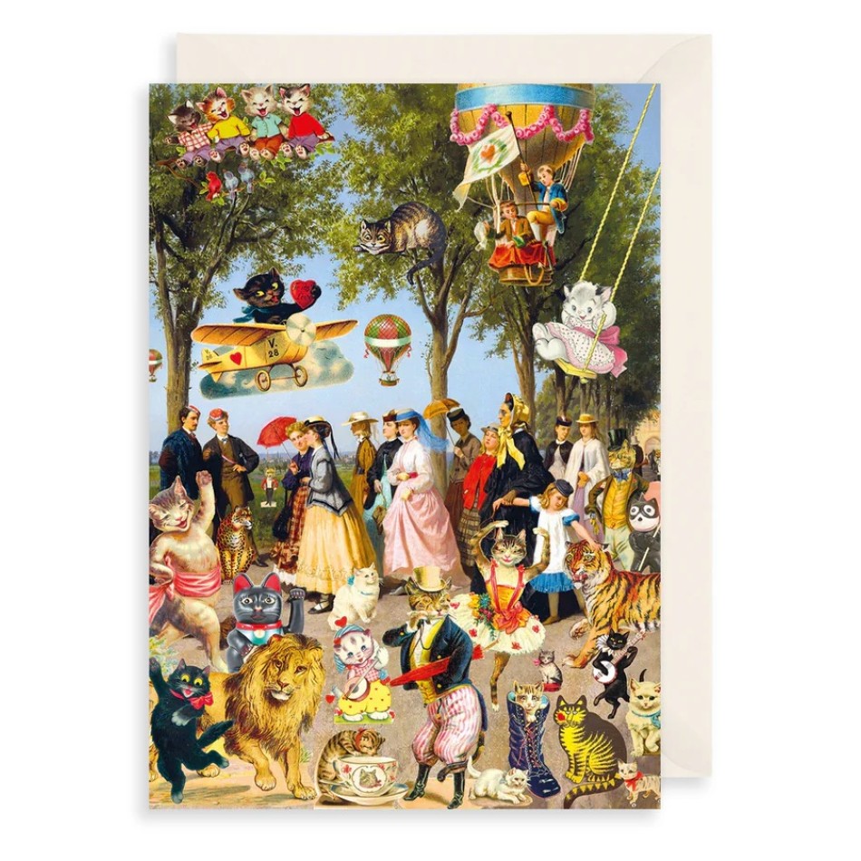• Представяме Ви очарователната Поздравителна картичка "Ден на цирка"! С причудлива илюстрация на цирков ден – екзотични котки, елегантно облечени хора и цветни балони – тя носи усмивка, радост и нотка носталгия, превръщайки всяко пожелание в малък празник.