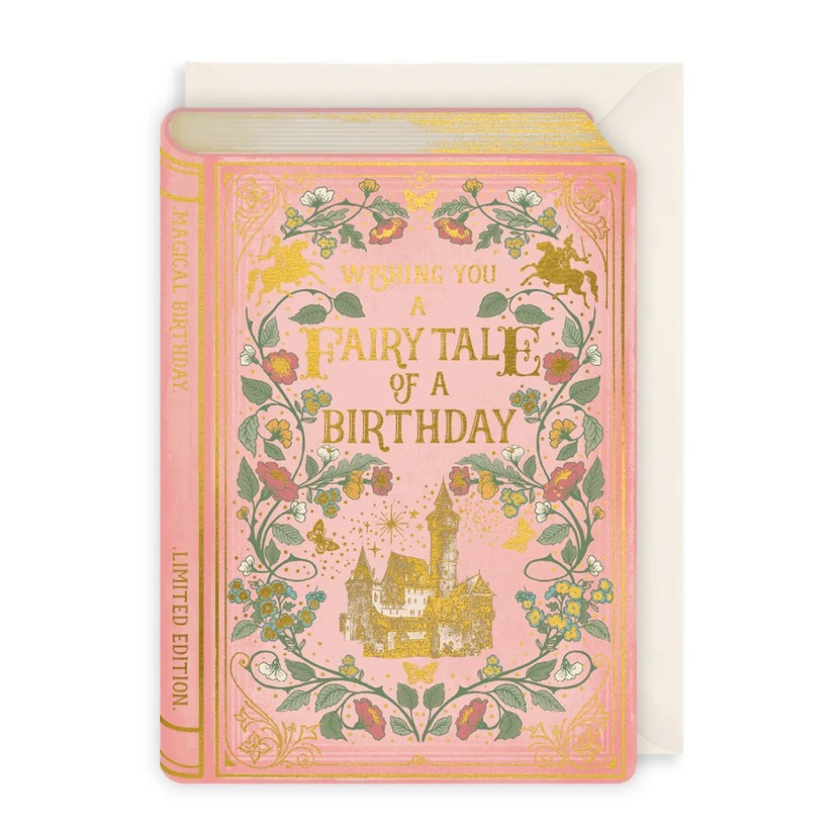 Създадена с приказно внимание към детайла: дигитален изрез, релеф и луксозно златно фолио върху текстурирана хартия. Отпред пише „Wishing you a fairytale of a birthday!“, а отвътре е празна за вашите най-топли пожелания!