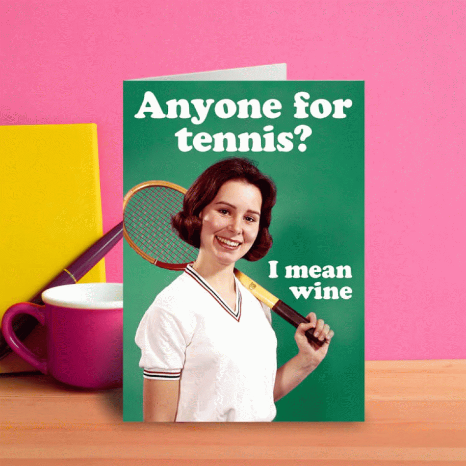 Поздравителна картичка – Някой за тенис? Искам да кажа вино