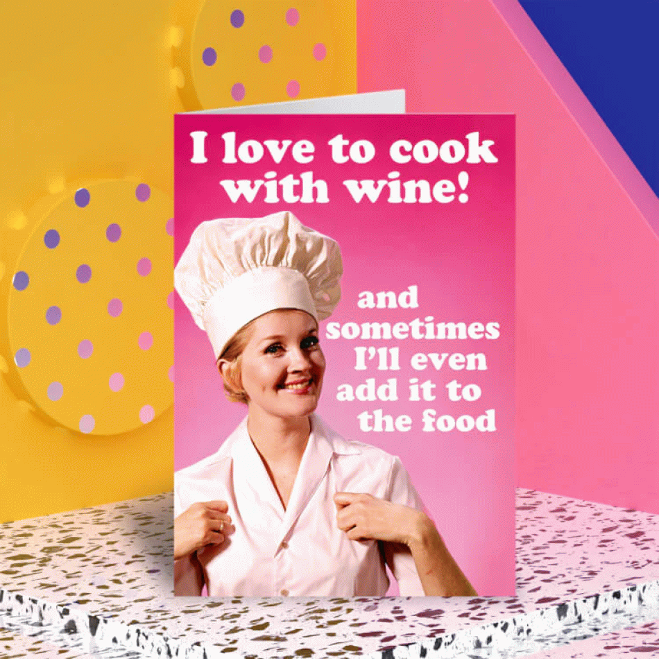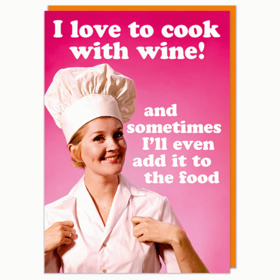 Ако обичате да готвите с малко (или много!) вино, тогава тази картичка е точно за вас! Перфектният начин да поздравите любителите на кухнята, които знаят, че малко вино може да направи всяко ястие още по-вкусно… и всяка ситуация много по-забавна!