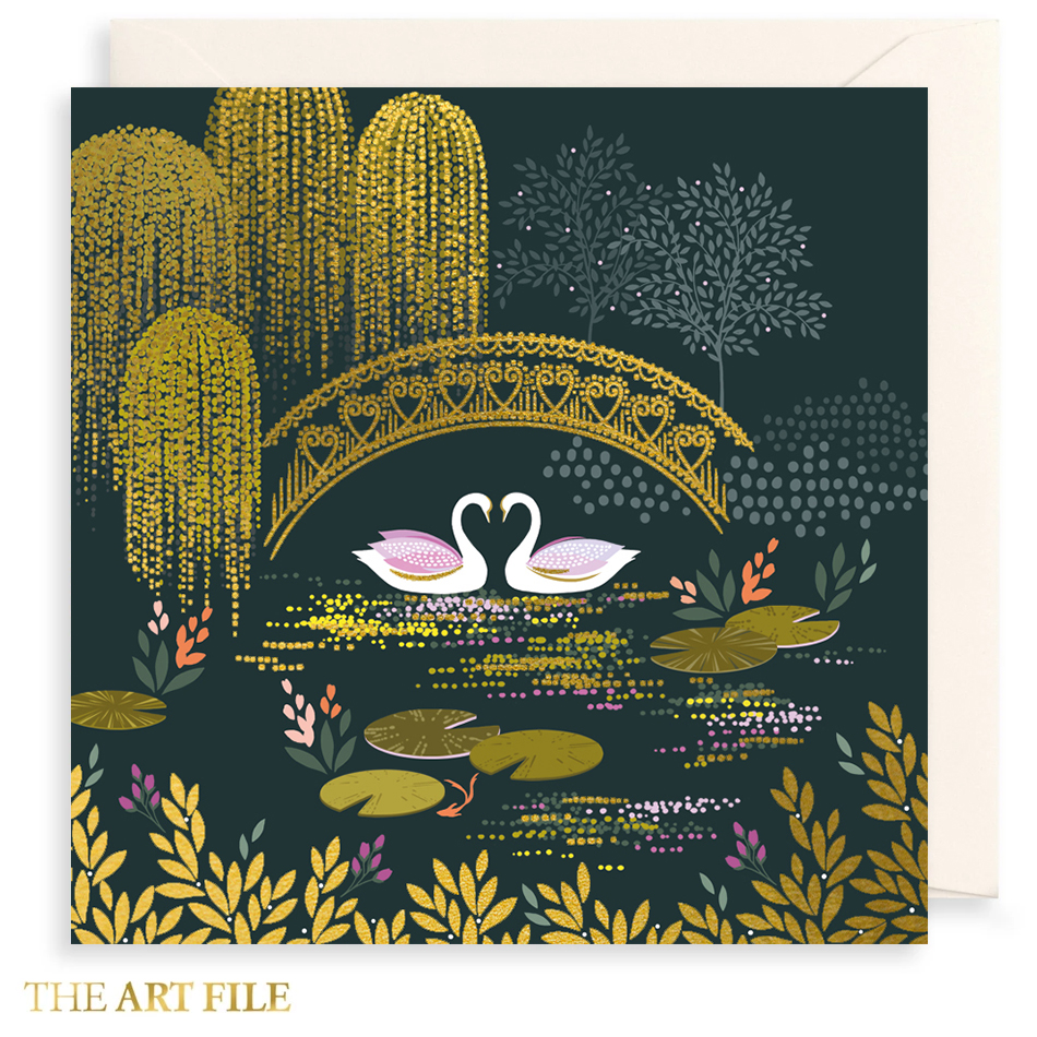Поздравителна картичка "Лебеди в езеро и златен мост"