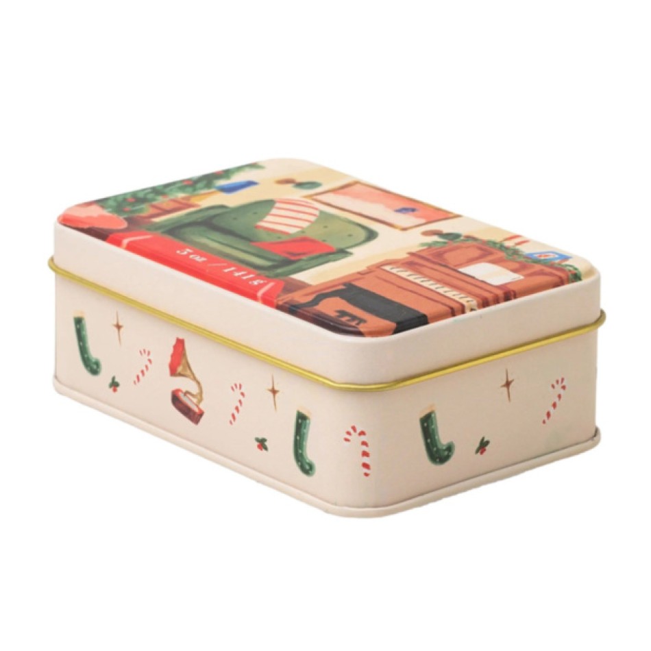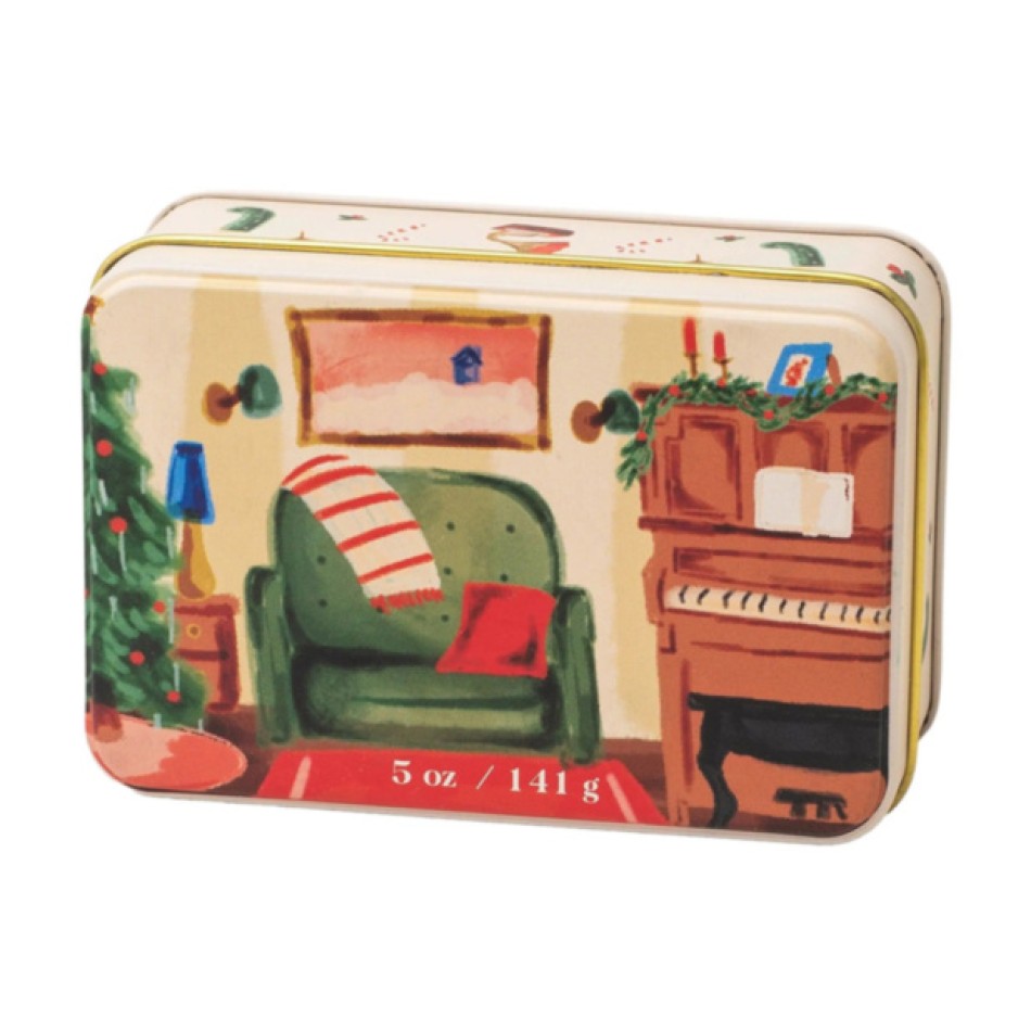 Свещта е поставена в красиво илюстрирана метална кутия с празнична сцена – уютен интериор с коледно дърво и пиано. Вътре се намира кремообразен соев восък с два фитила за равномерно горене и по-наситен аромат. Композицията „Нар и смърч“ е балансирана – плодова сладост, свежест и топли дървесни нюанси се преплитат в хармонично зимно ухание.