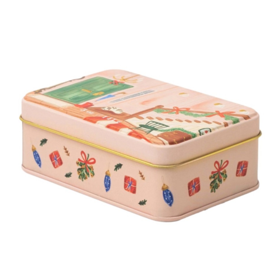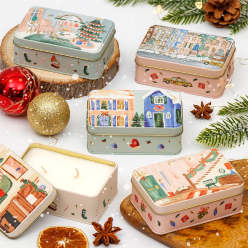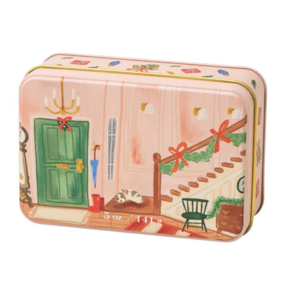 Свещта впечатлява с ръчно илюстрирана метална кутия, изобразяваща уютна коледна сцена със стълбище и празнична декорация. Вътре се крие кремообразен соев восък с два фитила, които осигуряват равномерно горене и по-интензивно ухание. Ароматът е вдъхновен от традиционна зимна напитка – богат, топъл и леко пикантен, създаващ усещане за празнична близост и домашен уют.