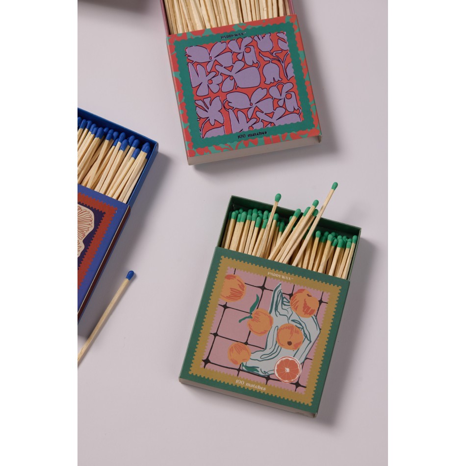 Кутията е ръчно илюстрирана с абстрактни флорални мотиви в модерна цветова палитра, допълнени от гланцови или металически акценти. Вътре се намират дълги кибритени клечки с цветни върхове, които съвпадат с дизайна и придават завършен визуален ефект. Благодарение на удължената форма, те са особено удобни за запалване на свещи, като същевременно добавят усещане за лукс и внимание към детайла.
