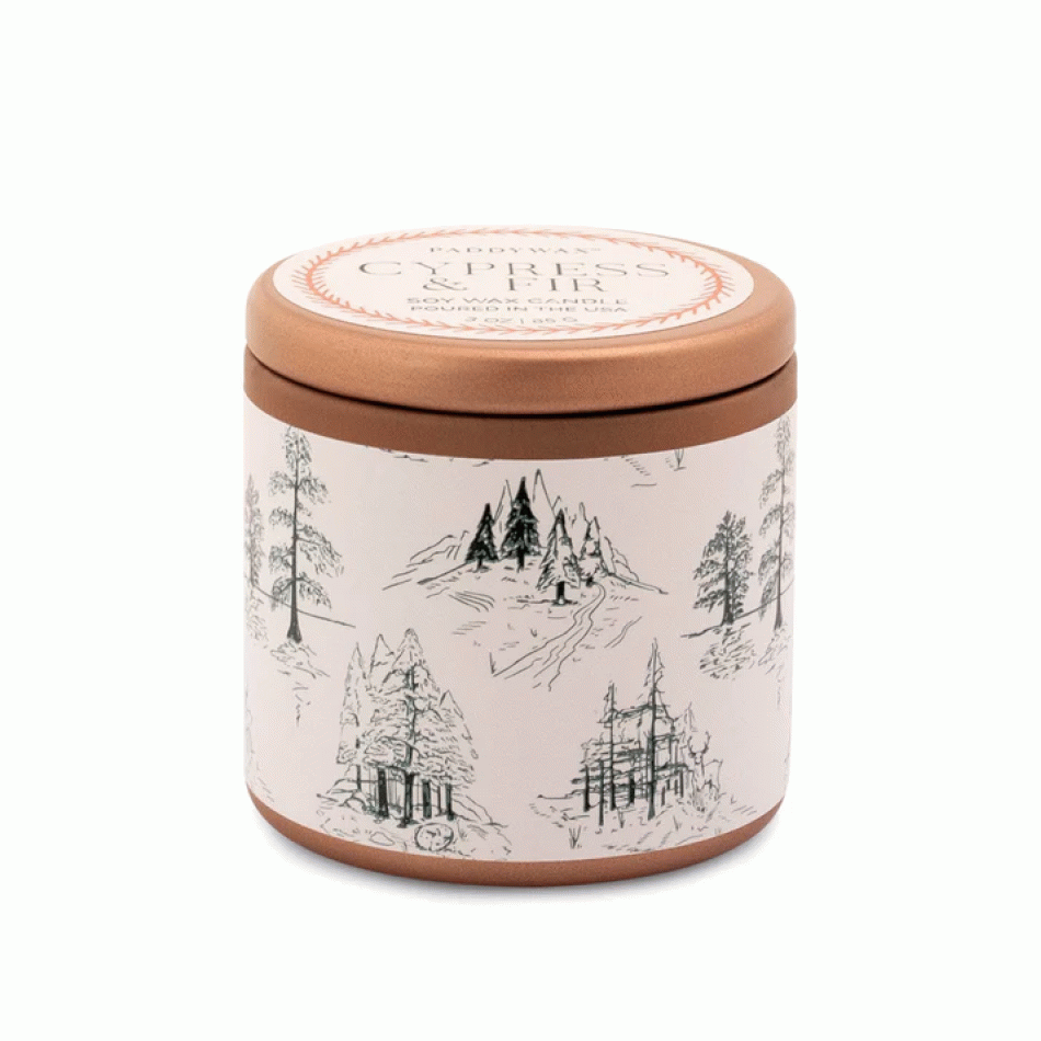 Метална медна свещ Падивакс, Кипарис и Ела - със зелен горски мотив на бял фон