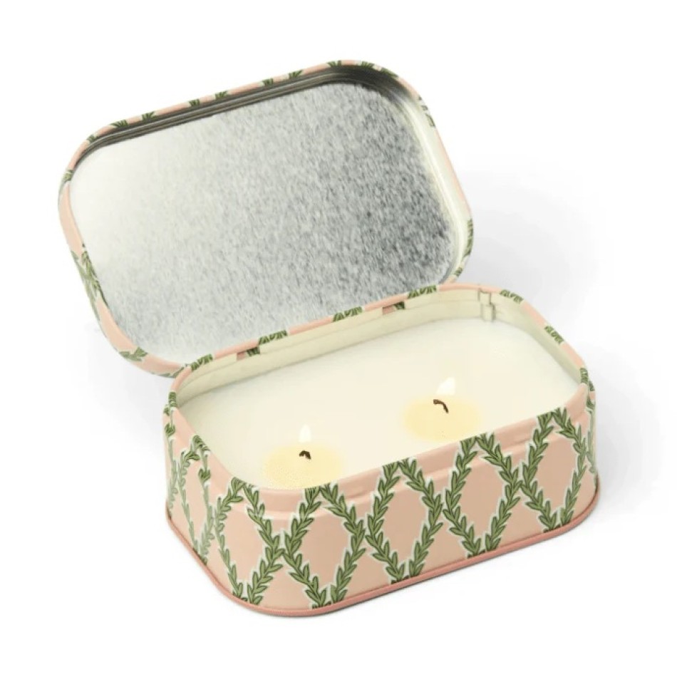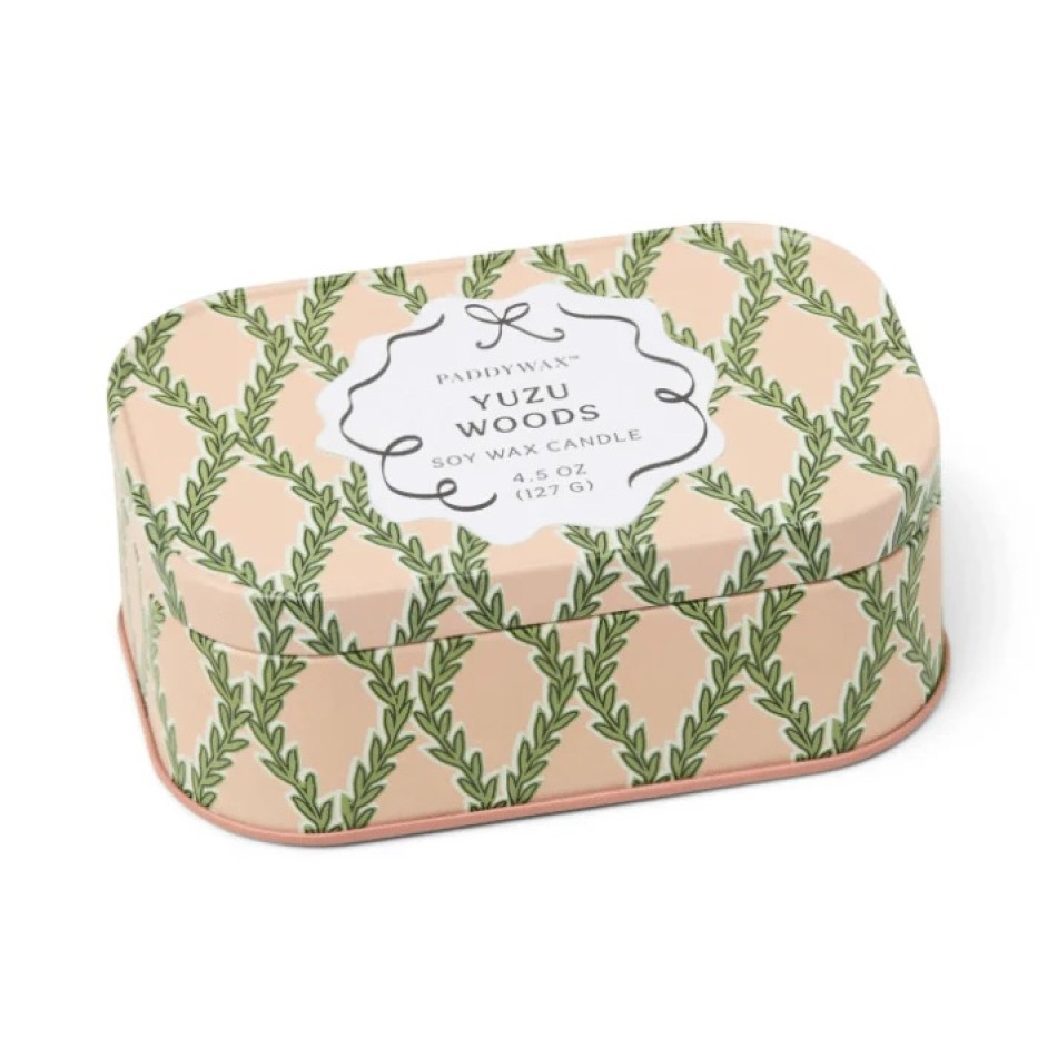 Метална соева свещ Падивакс, Шери кутия с принт - розово и зелено - юзу гори