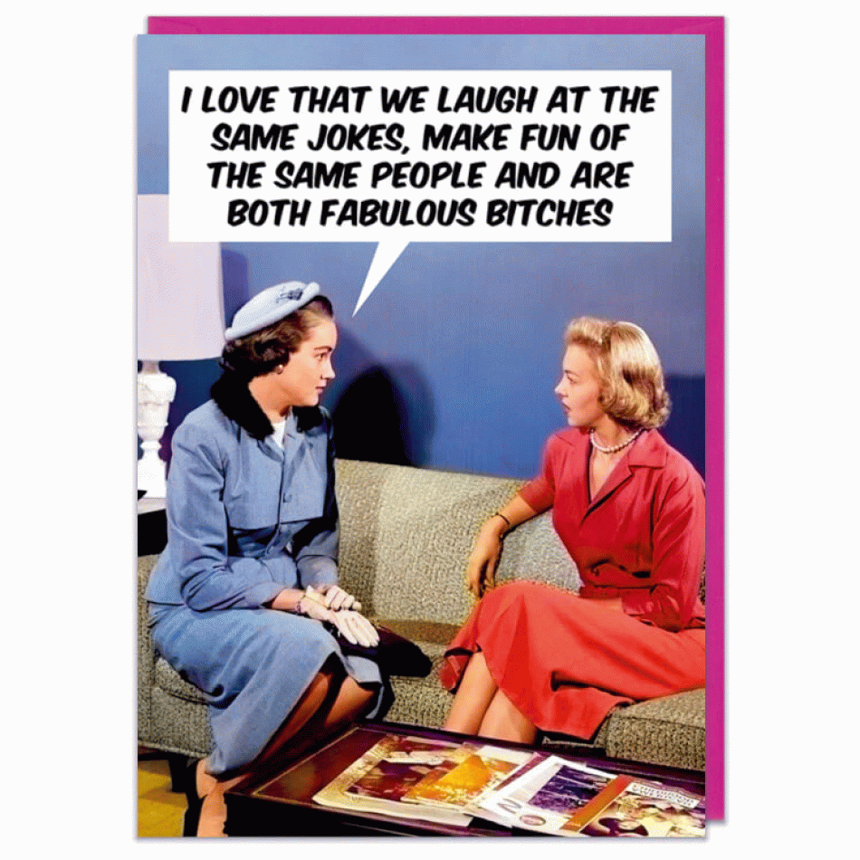 С ретро визия и остроумен текст, тази картичка е типичен представител на хумора „без филтър“. Идеална е за най-добра приятелка или близък човек, с когото споделяте едни и същи шеги (и вероятно клюки). Вътрешността е празна – защото най-добрите думи идват лично от Вас.