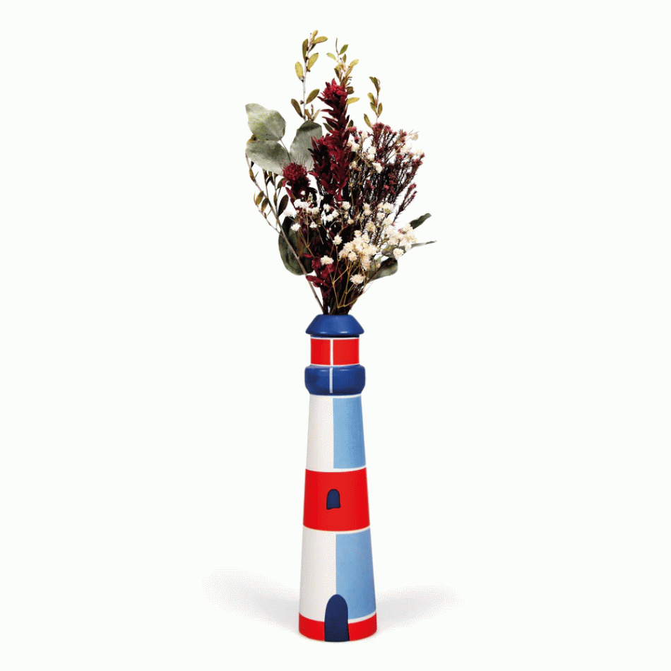 Тази ваза не е просто поредното декоративно изделие - тя внася свеж морски дух и стил в дома Ви. С нейния дизайн, вдъхновен от крайбрежието и фарове, тя преобразява всяка стая в уютен кът, който носи усещане за ваканция и спокойствие. За вас това означава: малко море вкъщи, веднага щом поставите цветя или сухи клонки - уют + стил, без да трябва да пътувате до брега.