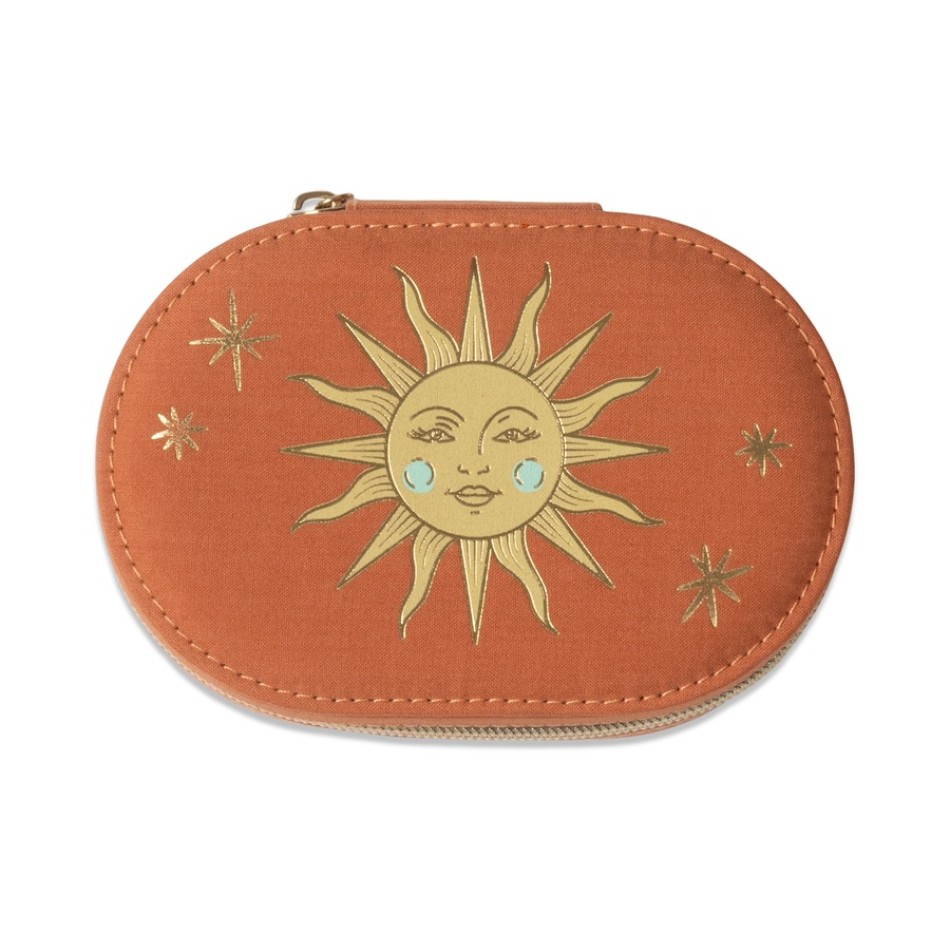 Този стилен красавец е обвит в елегантен плат с лъскави златни детайли на слънце и звезди, подплатен с меко кадифе, което нежно предпазва всичко – от колиета и пръстени до обици и малки тайни. Овалната форма е компактна и практична, идеална за ежедневие или пътуване, винаги с уау ефект и небесен чар.