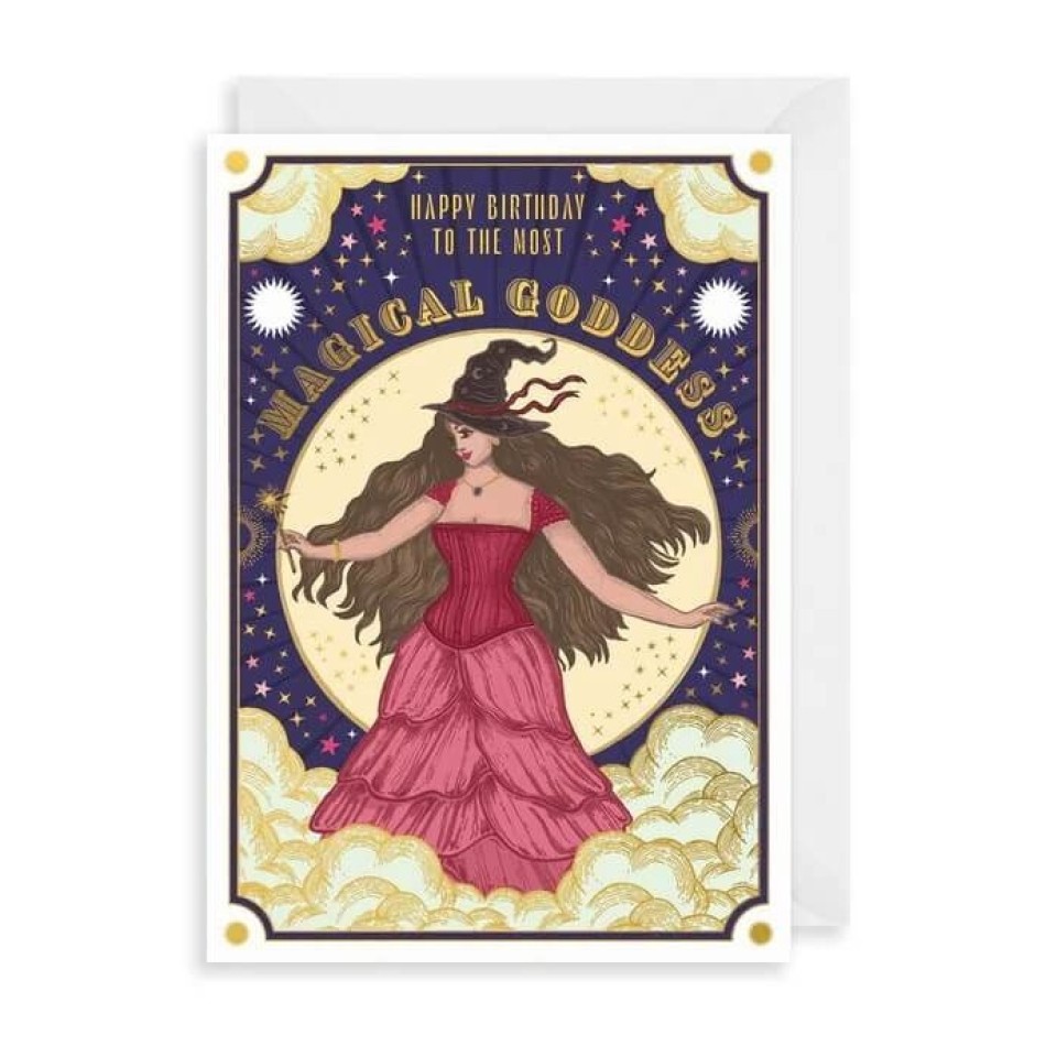 Копирайт: © The Art File Представяме ви уникалната Поздравителна картичка за рожден ден "Магична богиня" – магическо бижу с красива илюстрация на мистична жена в ролята на вещица/богиня по среднощно време, вдъхновена от духовност, красота и магия. На предната страна пише: „Честит рожден ден на най-магическата богиня!“. Тя ще поднесе доза вълшебство, ще накара получателя й да се почувства специален и божествен, и ще превърне празника в истински вълшебен момент с нотка мистика и чар!