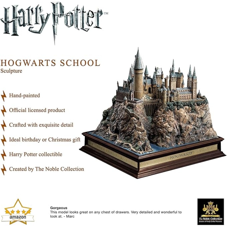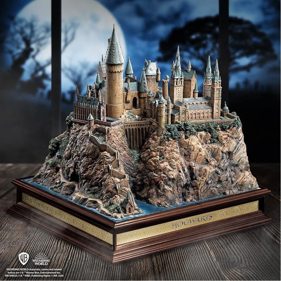 Копирайт: © & ™ Warner Bros. Entertainment Inc; Publishing rights © JKR - Замъкът Хогуортс - удивително детайлна и точна скулптура. Всяка сграда е сложно изваяна и ръчно рисувана. Училището е разположено на върха на скала, а озеленен ландшафт обгражда терена. Включена е дървена основа за показване. Височина е приблизително 33 см.