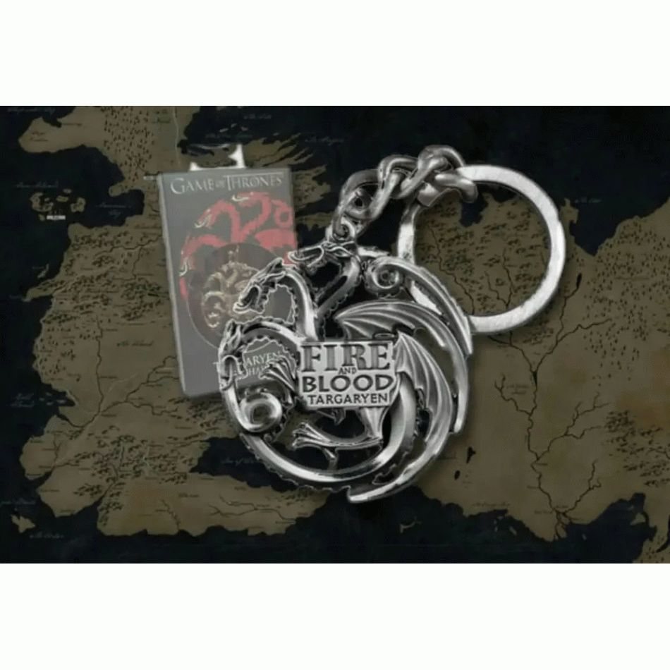 Изработен от метал с ефектно старинно покритие, този ключодържател представя триглавия дракон – емблемата на дома Таргариен – и привлича вниманието с класически дизайн. Подходящ е както за ежедневно ползване, така и за колекциониране, а компактният му размер прави носенето му удобно навсякъде.