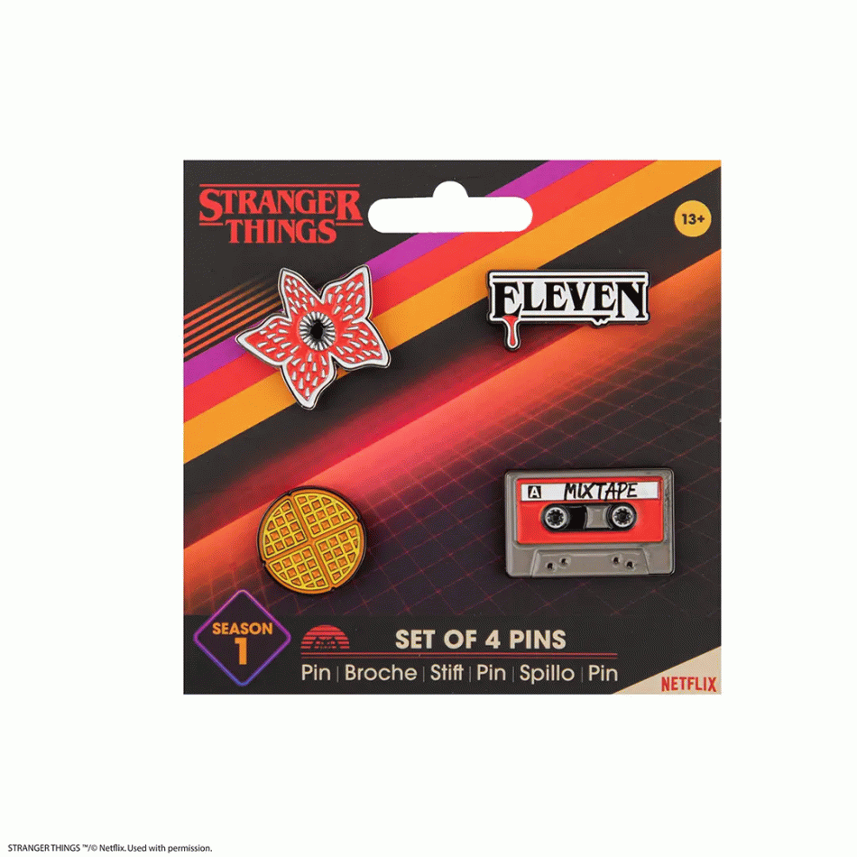 Копирайт: Stranger Things™ Покажете любовта си към класиката на Stranger Things с нашия официален Комплект от 4 значки, сезон 1 от Cinereplicas! Този комплект от 4 емайлирани значки е истинско съкровище за фенове на първи сезон – улавя най-иконичните елементи: вкусната Eggo вафла на Eleven, надписът „Eleven“, страховитият Демогоргон и ретро касетата от D&D приключенията. Те ви връщат директно в Хокинс 1983 г., добавяйки носталгия, мистерия и 80-те vibe към всяка тениска, раница или яке – идеални за ежедневно носене или колекциониране!