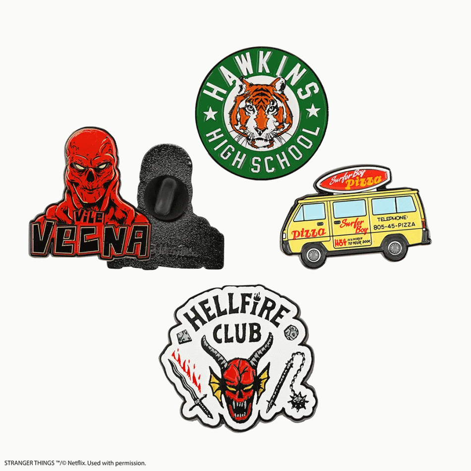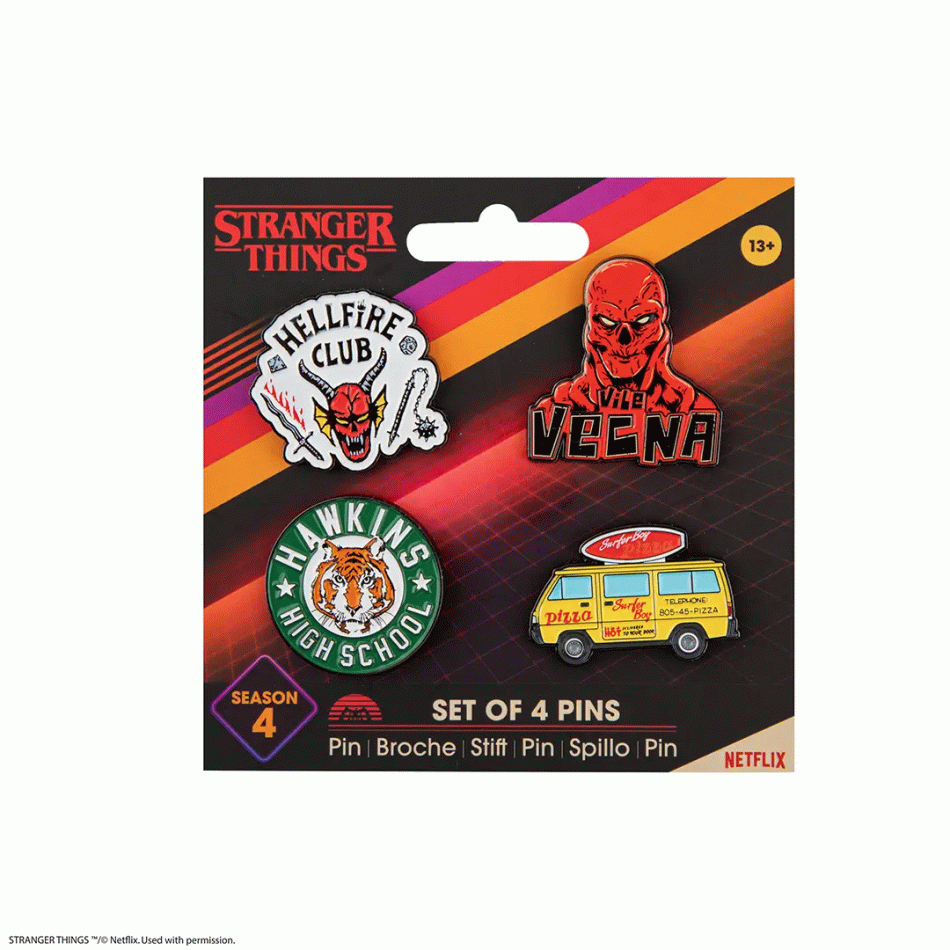 Копирайт: Stranger Things™ Покажете, че сте готови за битката с Vecna с нашия официален Комплект от 4 значки, сезон 4 - Странни неща/Stranger Things от Cinereplicas! Този сет от 4 емайлирани значки е епичен трибют към четвърти сезон – улавя най-иконичните елементи: Hellfire Club (D&D клуба на Еди), страховития Vecna, Hawkins High School и легендарната Pizzamobile. Те ви връщат в 1986 г. с пълна сила – носталгия, рок, ужас и приключения, добавяйки тъмна 80-те енергия към всяка тениска, раница или яке – идеални за фенове, които обичат да носят частица от най-интензивния сезон навсякъде!