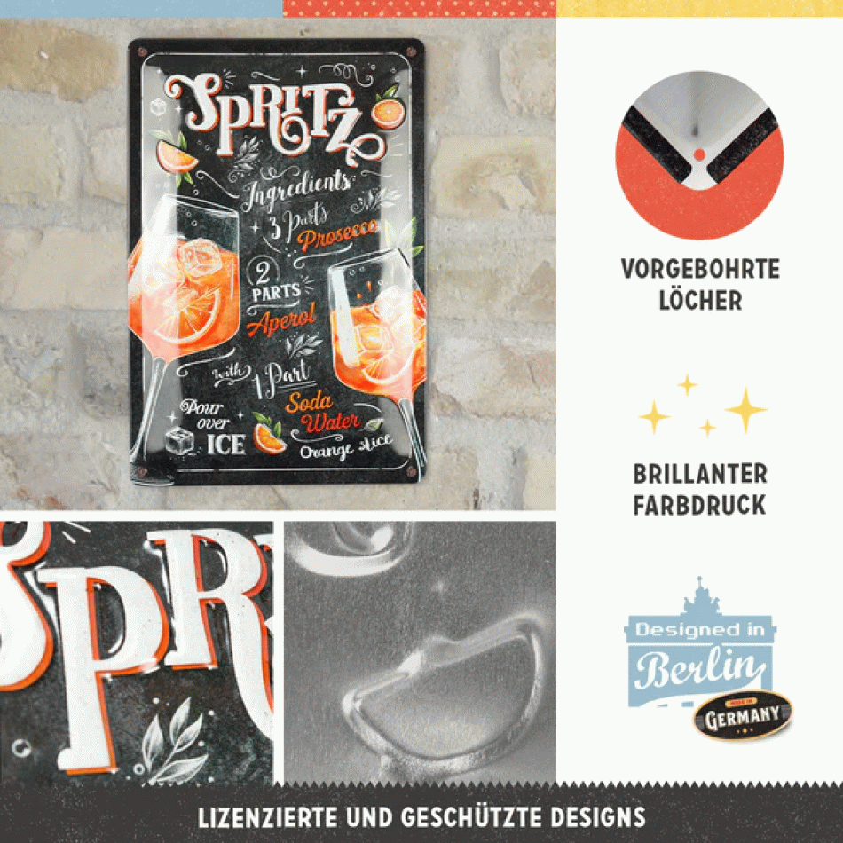 - Добавете ретро чар към вашия дом с металната табела Аперол Шприц от Nostalgic Art. С размери 20x30 см, тази висококачествена табела е изработена от здрава ламарина и е идеална за кухнята, бара или всекидневната. Ярките цветове и винтидж дизайн създават усещане за носталгия и стил. Табелата е част от колекцията "Open Bar" и е перфектен подарък за любителите на класическия италиански коктейл. Лесна за монтаж, тя придава уникален акцент на всяко пространство.
