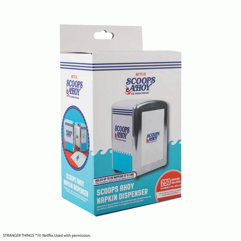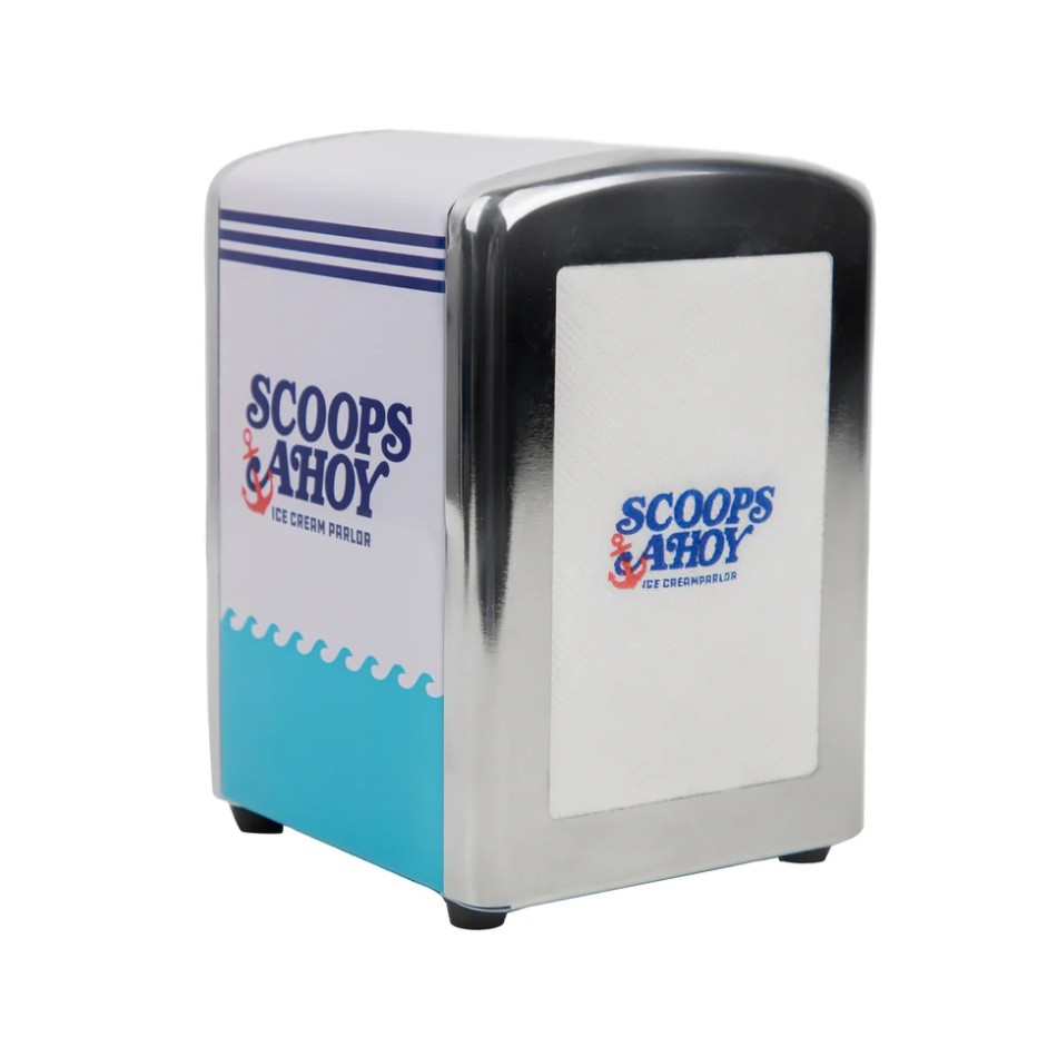 Изработен от винтидж калай с емблематичното Scoops Ahoy лого в класически синьо-червени цветове, той е здрав, стилен и включва 250 салфетки с брандирано лого за пълен тематичен ефект. Перфектен за да декорирате масата, да създадете Scoops Ahoy ъгъл или като страхотен подарък за истински фен – лесен за употреба и пълен с ретро чар!