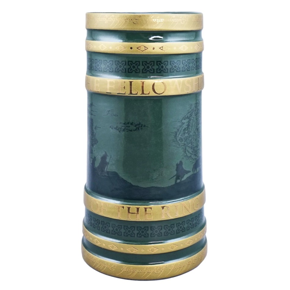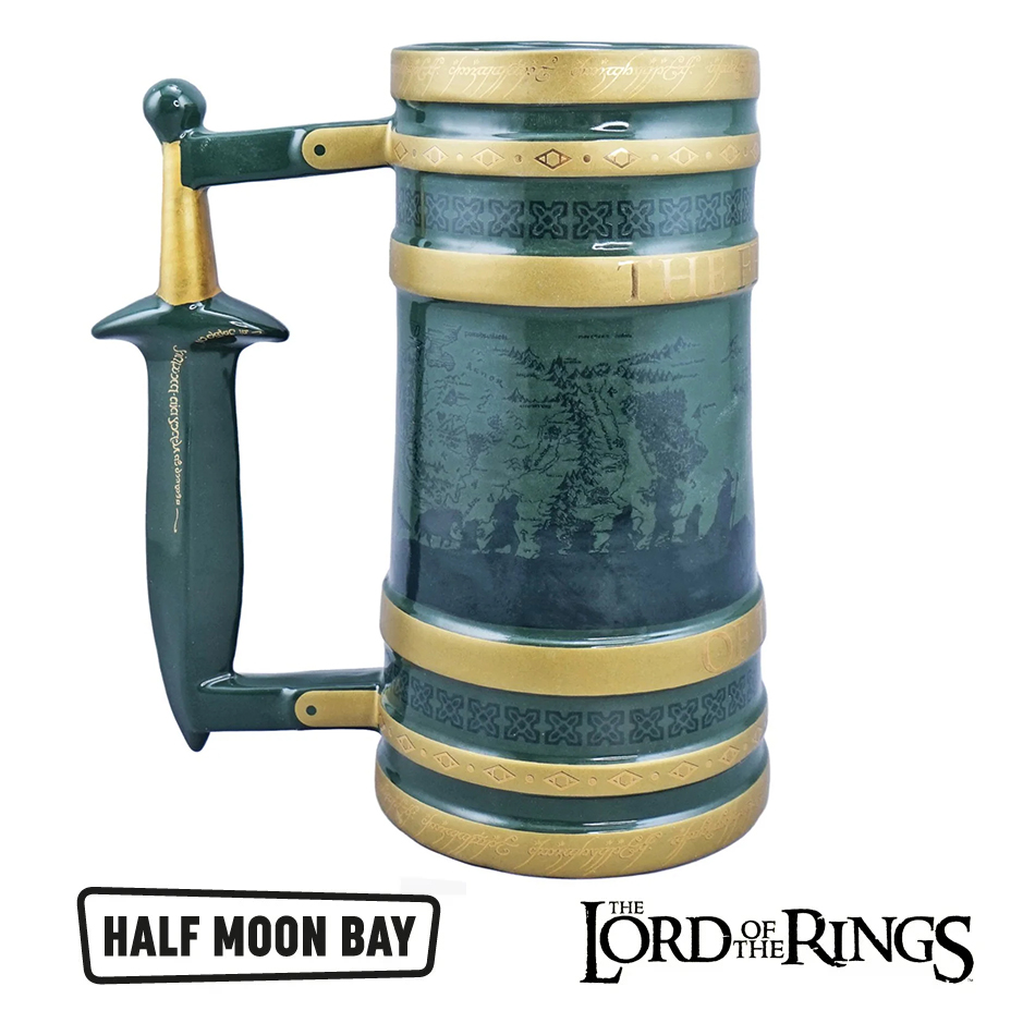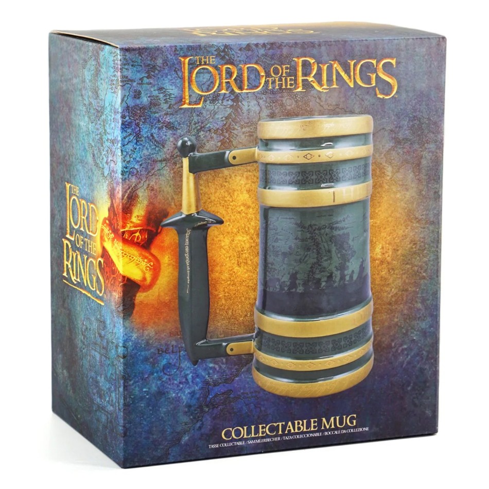 Халбата е изключително красива и голяма, като за джуджета с големи бради. Изработена е от плътна керамика и е ръчно рисувана. Халбата наподобява метална халба с красива зелена патина, в която всъщност ще забележите силуетите на задругата, и няколко златни ринга. Освен украсни елементи, на ринговете ще прочетете и надписа "Задругата на пръстена", а дръжката ювелирно се превръща в изкован меч със златни елфически надписи.