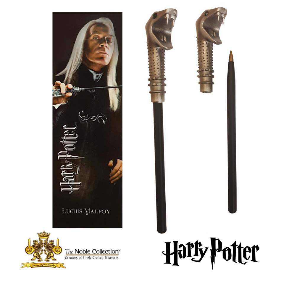 - Производител: The Noble CollectionКопирайт: © & ™ Warner Bros. Entertainment Inc; Publishing rights © JKRМагическата пръчка на Луциус Малфой се превръща в химикалка, когато не ви е наложително да правите магии. А когато забравите до коя магия сте сигнали в настолната ви магическа книга, книгоразделителят, ще ви помогне да отбележите правилната страница.Репликата на пръчката-химикалка изцяло следва визията, която познаваме от продукциите на Warner Bros., изработено е от висококачествена пластмаса и е със синьо мастило. Книгоразделителят не се огъва и изобразява Малфой и логото на Хари Потър.