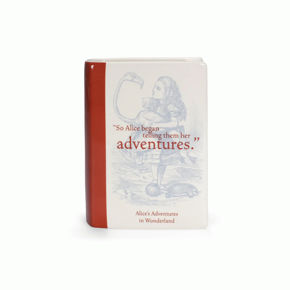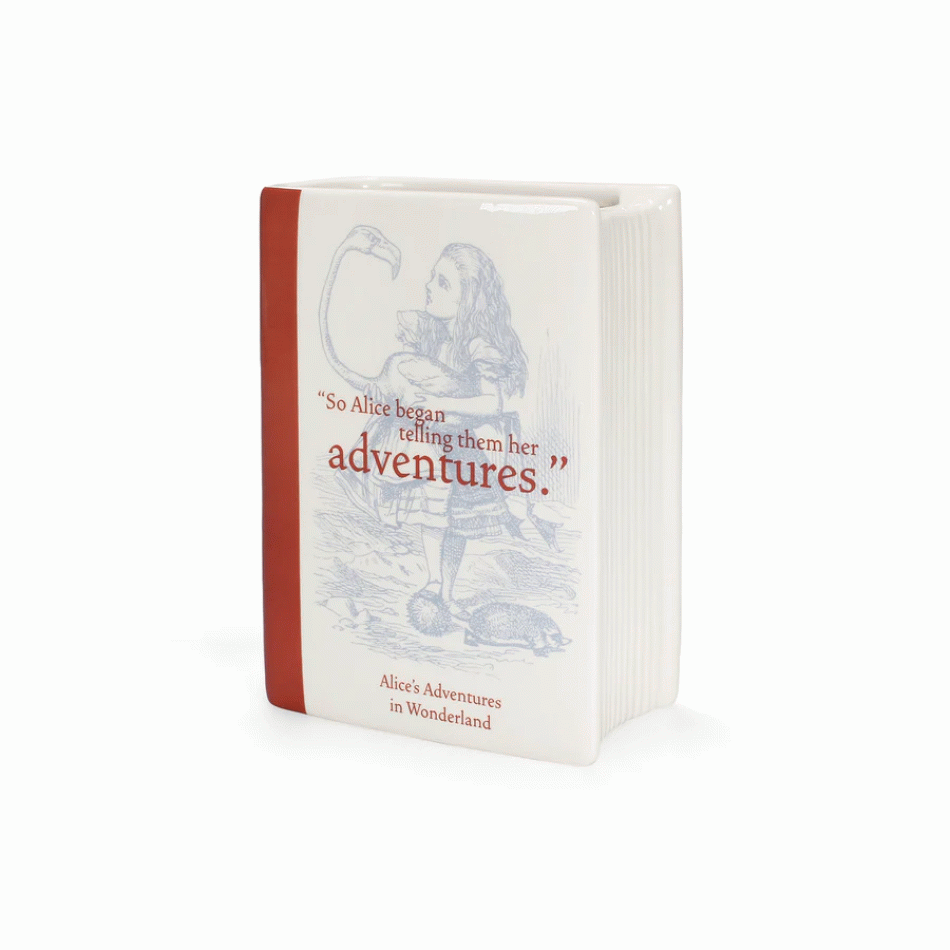 We present to you our ceramic vase "Alice in Wonderland" from the Pulteney Press collection. This exquisite 14 cm tall vase is shaped like a book and is inspired by Lewis Carroll's timeless tale. It's the perfect accent for your home or office, adding literary charm and elegance.