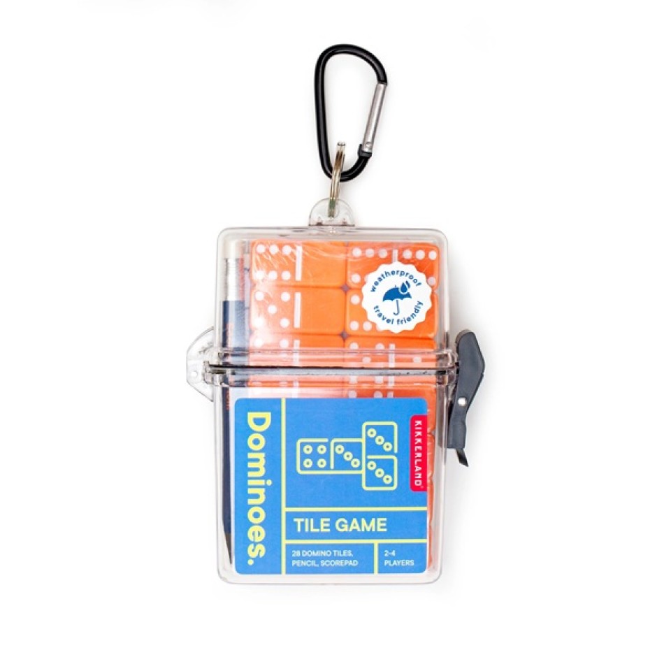 - Meet Dominoes. – the portable, waterproof domino set that lets you stack classic chains anywhere without fear of rain, splashes or unexpected weather turns! This game of strategy and patience is perfect for camping, the beach, a picnic, a road trip or just an evening out – gather friends and family around a table (or on a blanket on the ground!) for hours of laughter, competition and the satisfaction of a perfectly landed chain. IPX5 water resistance, a locking clip and a carabiner ensure everything stays dry, secure and ready for the next game – even if it falls into the river or rains suddenly!Includes 28 durable tiles, a permanent pencil (writes wet!), a stone paper scoreboard, and instructions - all in a compact, sturdy case that fits in a backpack or pocket. The design is stylish, practical and made especially for outdoor adventures!