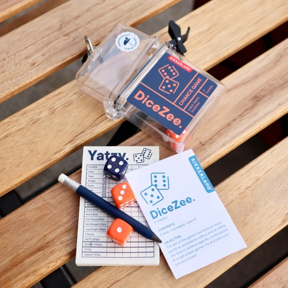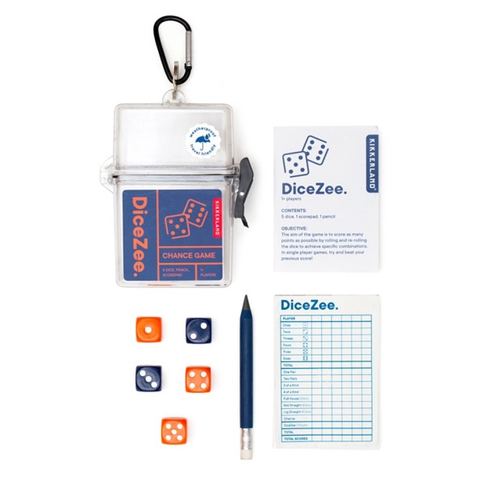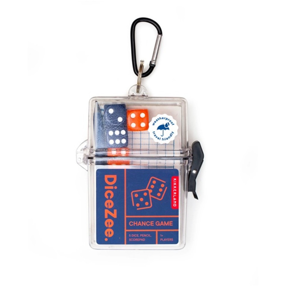 - Dicezee - the compact, waterproof dice set that lets you challenge your luck anywhere, anytime! This fun game of chance is perfect for camping, the beach, car rides, mountain walks or just an evening by the fire – without the worry of rain, splashes or lost parts. IPX5 water resistance, a locking clip and a carabiner for attaching to a backpack ensure everything stays dry, secure and ready for action. It gathers friends around the table (or the ground!) for quick rounds of laughter, risk and unexpected twists – perfect for spontaneous outdoor games!Includes 5 dice, a permanent pencil (that writes even when wet!) and a stone paper scoreboard - all in a sturdy, portable case.