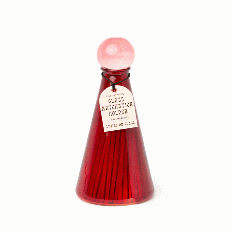 Copyright: © Paddywax - Add an eye-catching accent to your small spaces and shelves with our Glass Jar of Matches. These beautiful luxury glass jars with safety matches are the perfect statement piece for your home decor with their unique shapes, colourful tint, and elegant function. Each jar of matches comes with a match striker on the back and colour coordinating hang tag.