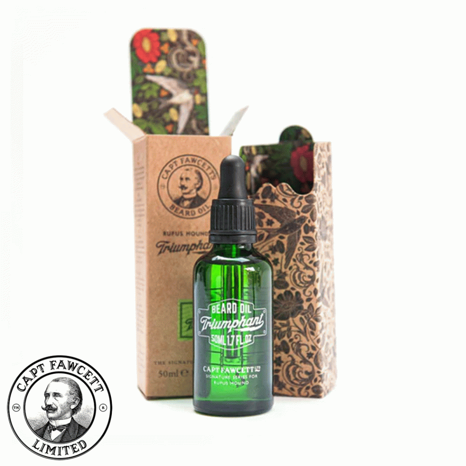 Captain Fawcett’s Triumphant collaboration with actor and comedian Rufus Hound has resulted in a splendiferously nourishing Beard Oil. A delightful fragrance somewhat reminiscent of the balmy days of Spring; olfactory rural stimuli reaped whilst riding his beloved motorcycle through England’s green & pleasant countryside.