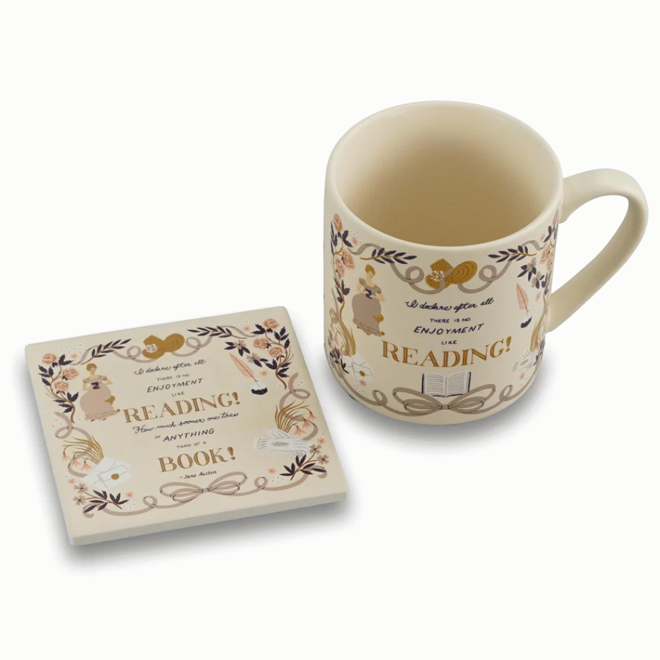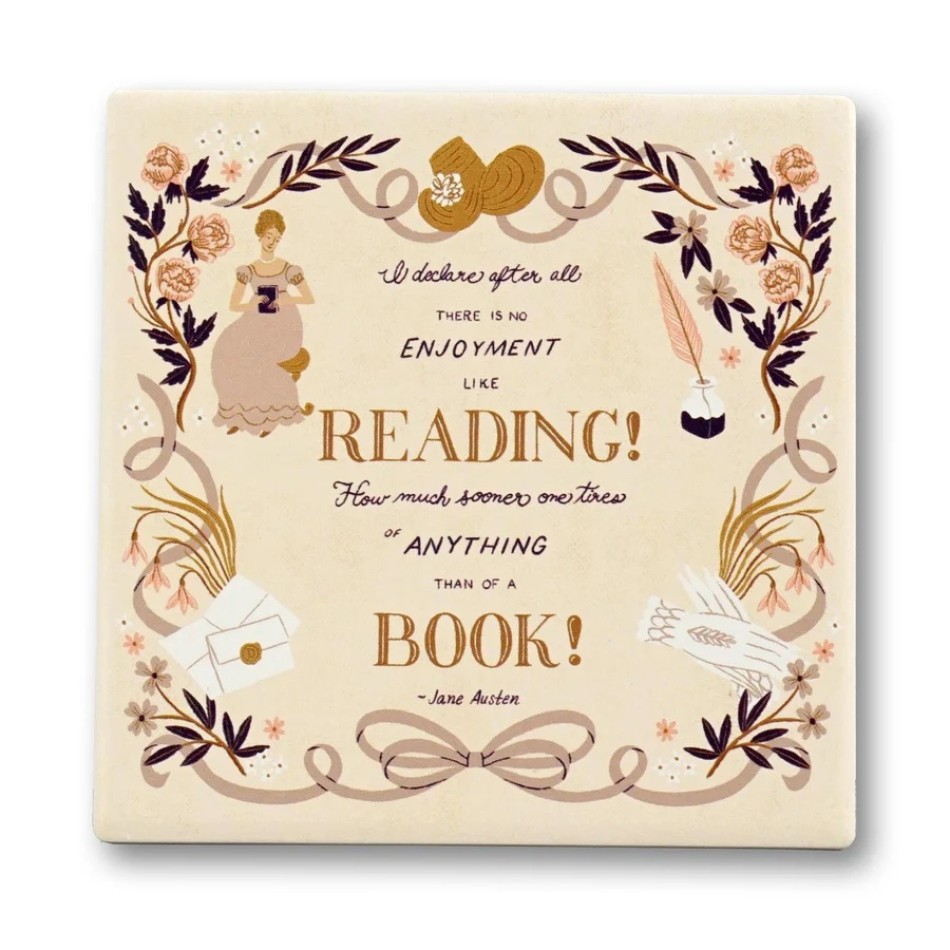 - If you believe that the perfect moment involves a book and a cup of hot drink, this coaster is made for you. Inspired by the inimitable style of Jane Austen, it brings literary charm, elegance and that quiet pleasure that only a good story can give.With the iconic quote “I declare after all there is no enjoyment like reading!”, the coaster doesn’t just protect surfaces – it reminds you of the small, precious moments of peace and inspiration. Perfect for lovers of classic literature and cozy afternoons with a book.Made of sturdy ceramic, it is practical and durable, and its compact size makes it convenient for everyday use. A small accessory with a big literary heart.