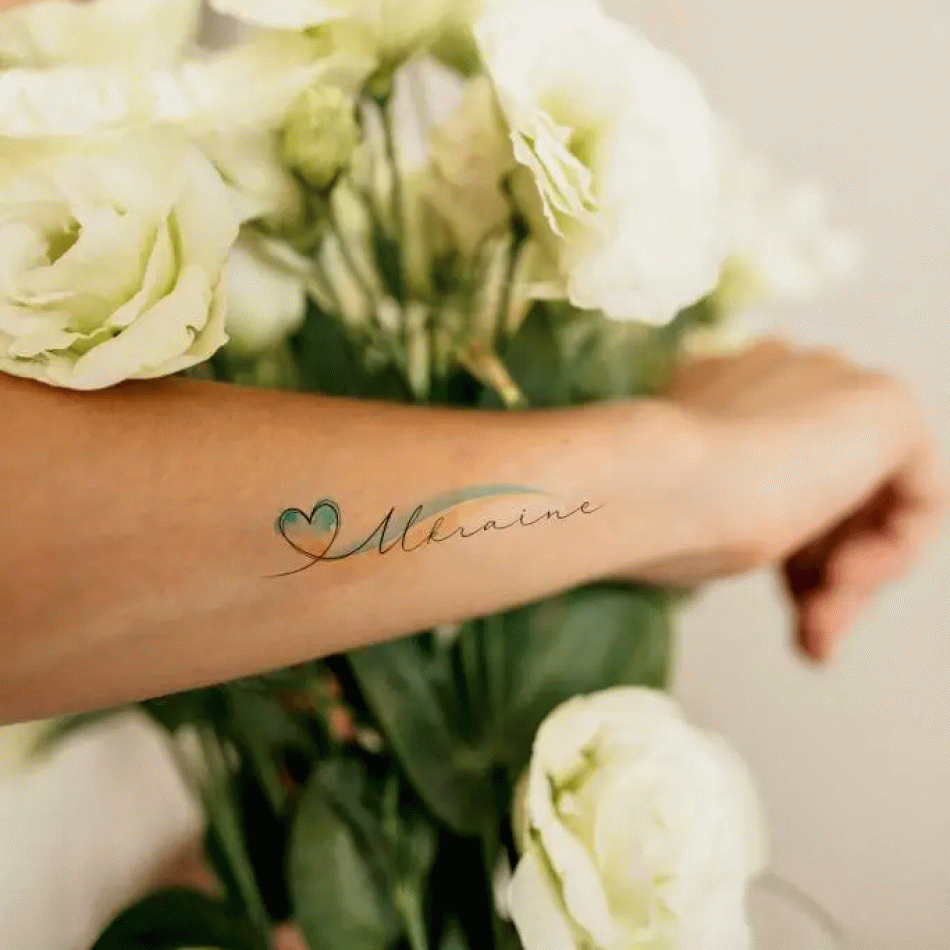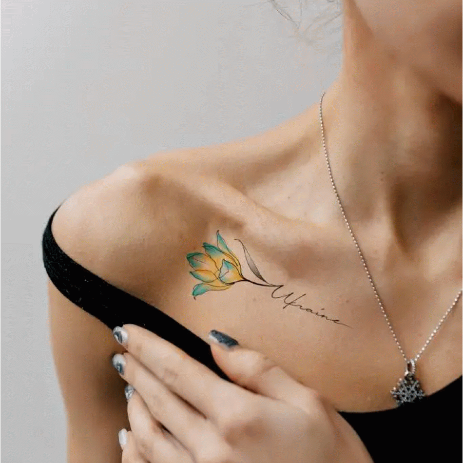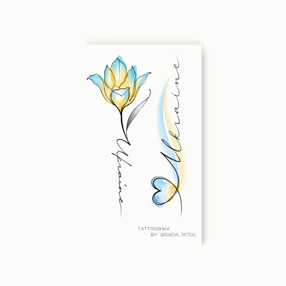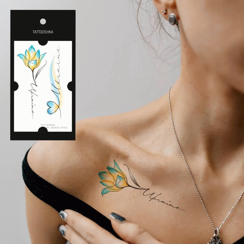 - Gentle, with the brush... thin, with the soul... in blue and yellow... in the colors and with a flower for Ukraine! A tattoo that shows support - quiet, silent, calm, but dignified!Tattoos are easily applied to the body with water in just 30 seconds. But they look real and will fool even the most outspoken tattooist in the world. The sticker tattoos are waterproof and stay on the body for up to 7 days.This size is suitable for arms, chest, face, wrists, neck, thighs, legs, back and generally - whole body!