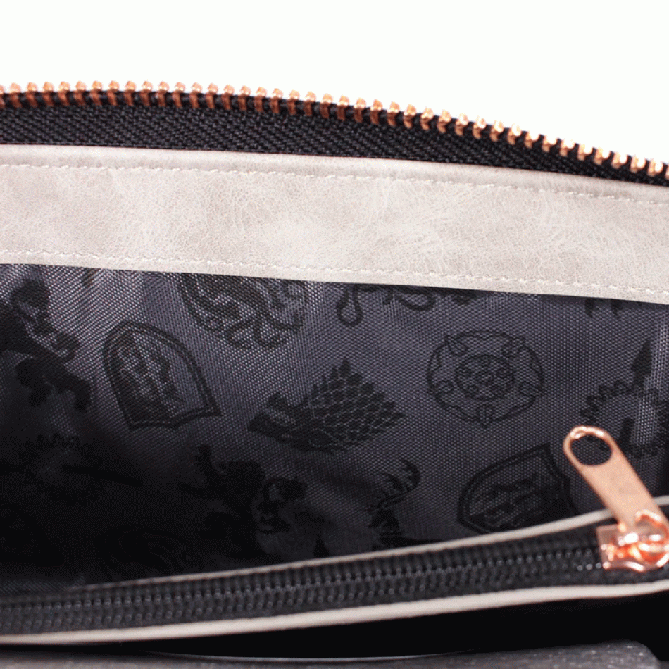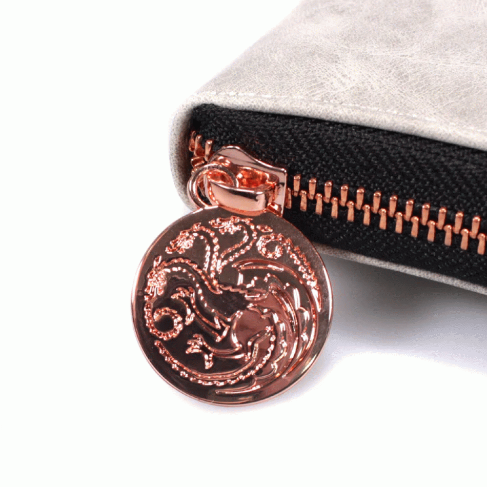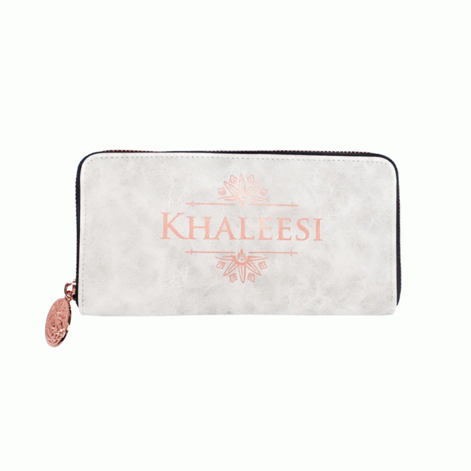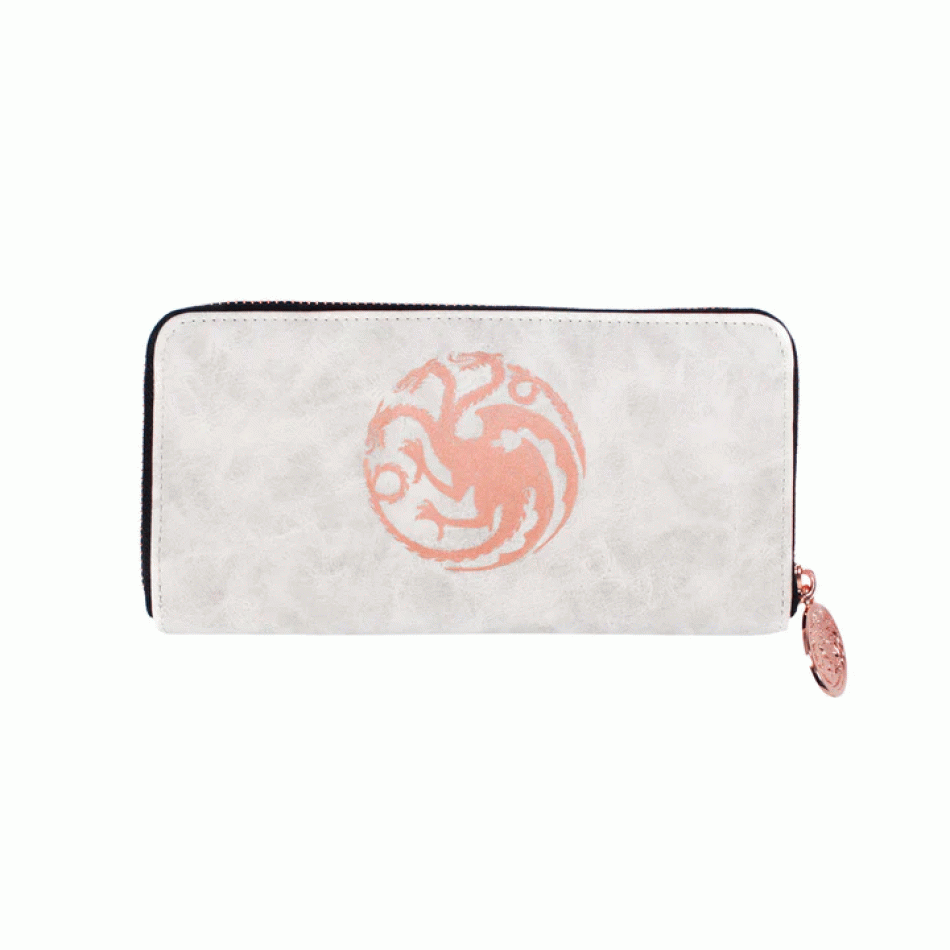 © Official HBO Licensed Product - This Game of Thrones purse is the perfect safe place for Gold Dragon coins. Part of the Khaleesi range, the purse is made in a pale grey suede effect material. The front features the Targaryen house sigil, a three-headed dragon, in rose gold foiled detail. The back features the word 'Khaleesi".