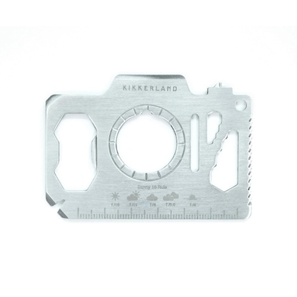 - Meet our Camera Multi-Tool from Kikkerland – a miniature camera that doesn’t take pictures, but saves the day with 14 tools in your pocket! This super-compact multi-tool is unique in its design: it looks like a retro camera (even with a round hole for “focus”), but it hides a whole arsenal for photographers, travelers or anyone who likes to be prepared. Practicality + humor in the size of a credit card – instead of looking for a screwdriver or a can opener, you just take out the “camera” and become the hero of the moment. The perfect gift for photographers who want the Sunny 16 rule always at hand!This stainless steel plate is like a Swiss army knife for the modern man: super thin, light, and always ready for action – cuts, twists, opens, measures, and even reminds of the exposure. Compact for a wallet or keychain, durable, and with a dose of nostalgia – every time you take it out, you will cause “Wow, this is a camera?!” and smiles. Perfect for camping, traveling, photo shoots or everyday small repairs!