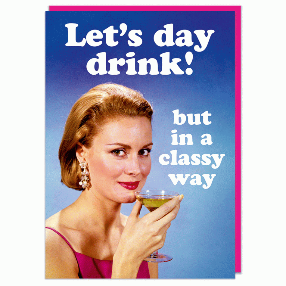 A funny retro birthday card featuring a smiling young woman looking to camera and holding a cocktail glass. Rounded white text above and beside her reads Let's day drink, but in a classy way. - • Card dimensions: 126x178mm