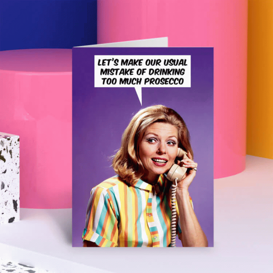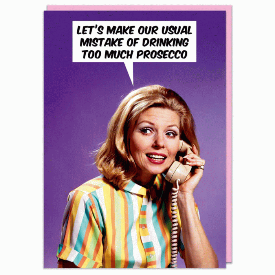 A funny birthday card with a retro photo of a young woman in a stripy dress on the phone. She is asking Let's make our usual mistake of drinking too much prosecco. - • Card dimensions: 126x178mm