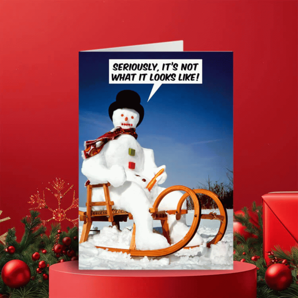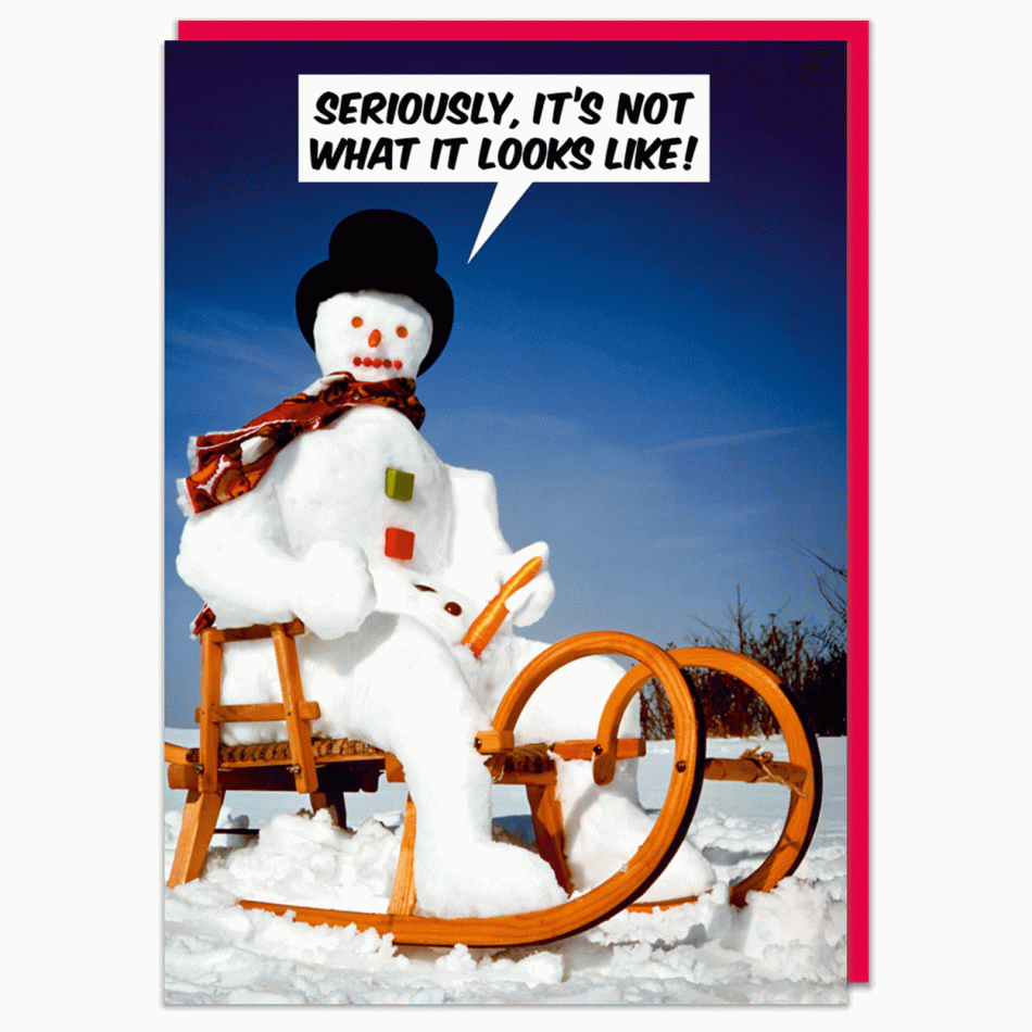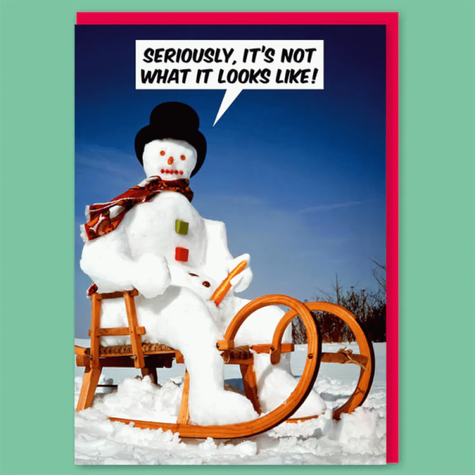 Copyright: Dean Morris Cards - Introducing the "It's Not What It Looks Like" card – a humorous greeting with a slightly mischievous twist that guarantees surprised smiles. With its provocative yet playful plot, it turns a classic holiday scene into a moment of pure comedy effect – because sometimes the funniest situations are exactly those that "are not what they seem".This card impresses with the typical Dean Morris style – a retro look, straightforward humor and a slightly awkward but extremely funny situation with a snowman. It is suitable for people with a sense of humor who appreciate bolder jokes. The inside is empty – for your personal addition.