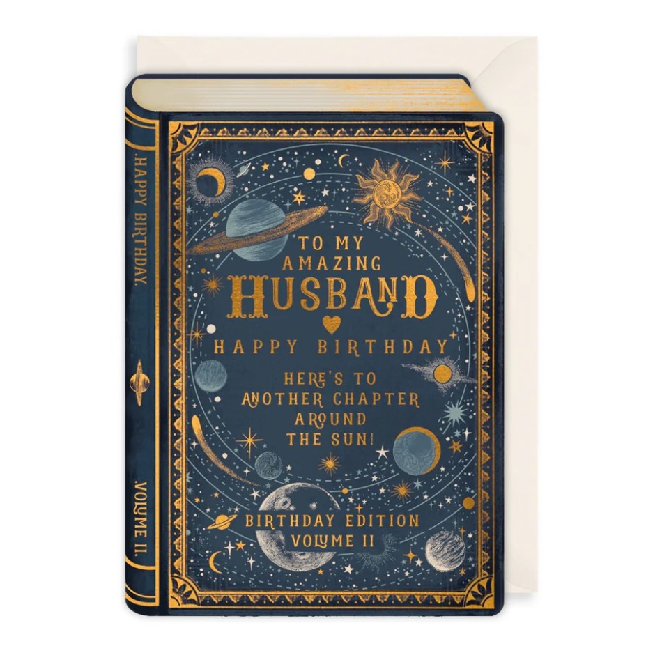 Copyright: © The Art File - Discover the unique Birthday Greeting Card - Space Book, To my wonderful husband! – a book with a space scene that will turn your husband's birthday into a magical adventure! It will bring a smile, romance and unforgettable emotions, symbolizing a new chapter in your life.Created with elegance: reliefs, gold foil and textured paper. Blank inside for your messages!