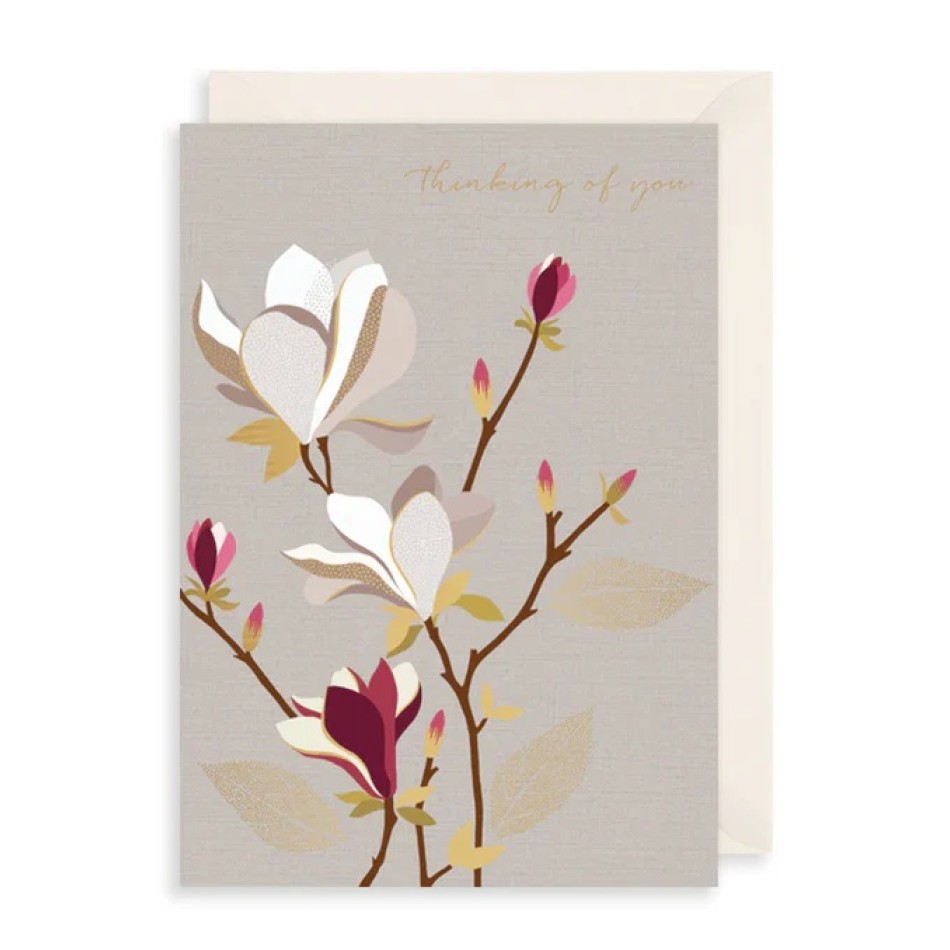 Copyright: © The Art File - We present to you the unique card "Magnolia - I'm thinking of you" - a delicate and elegant piece of jewelry with a beautiful illustration of a blooming magnolia that radiates peace, warmth and natural beauty. It says "Thinking of you" on the front, and with deep embossing and shimmering gold foil, it adds a luxurious, premium touch. Perfect to show that you are thinking of someone at a special time - it will bring comfort, joy and a feeling of care!With typical British craftsmanship from The Art File, the card is printed on luxury 280gsm paper. It is blank inside - for your personal, warm, heartfelt or inspirational message. Made in the UK, with a cream linen envelope included - perfect for 'thinking of you' moments, support, friendship or just to remind a loved one that they are in your thoughts!